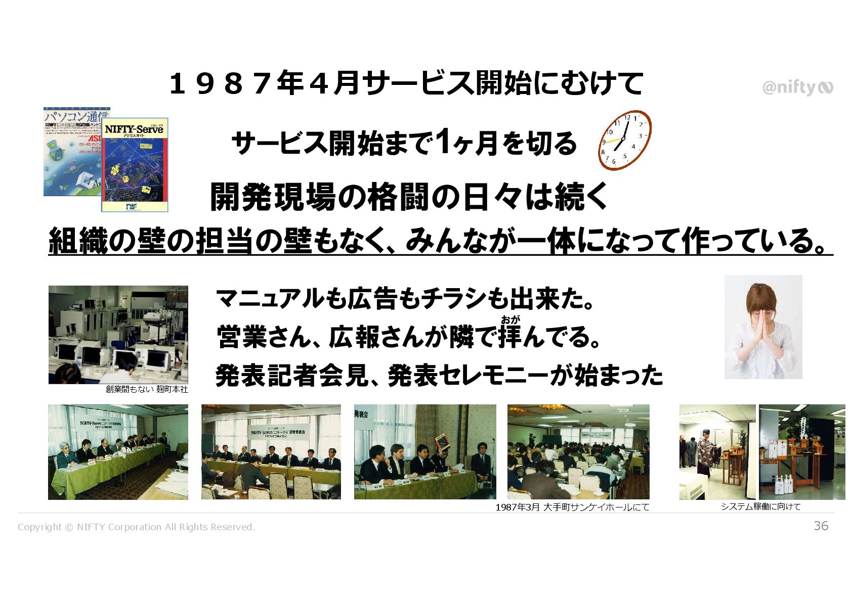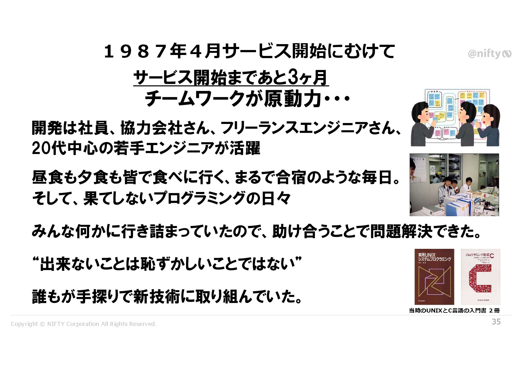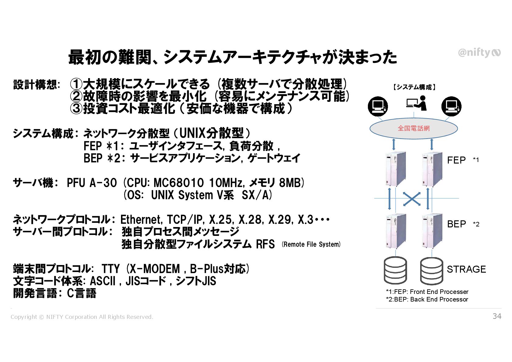 (複数サーバで分散処理) ②故障時の影響を最小化 (容易にメンテナンス可能) ③投資コスト最適化 (安価な機器で構成) システム構成: ネットワーク分散型 (UNIX分散型) FEP *1: ユーザインタフェース, 負荷分散 , BEP *2: サービスアプリケーション, ゲートウェイ サーバ機: PFU A-30 (CPU: MC68010 10MHz, メモリ 8MB) (OS: UNIX System V系 SX/A) ネットワークプロトコル: Ethernet, TCP/IP, X.25, X.28, X.29, X.3・・・ サーバー間プロトコル: 独自プロセス間メッセージ 独自分散型ファイルシステム RFS 端末間プロトコル: TTY (X-MODEM , B-Plus対応) 文字コード体系: ASCII , JISコード , シフトJIS 開発言語: C言語 FEP BEP 全国電話網 【システム構成】 STRAGE *1:FEP: Front End Processer *2:BEP: Back End Processor *1 *2 最初の難関、システムアーキテクチャが決まった (Remote File System)