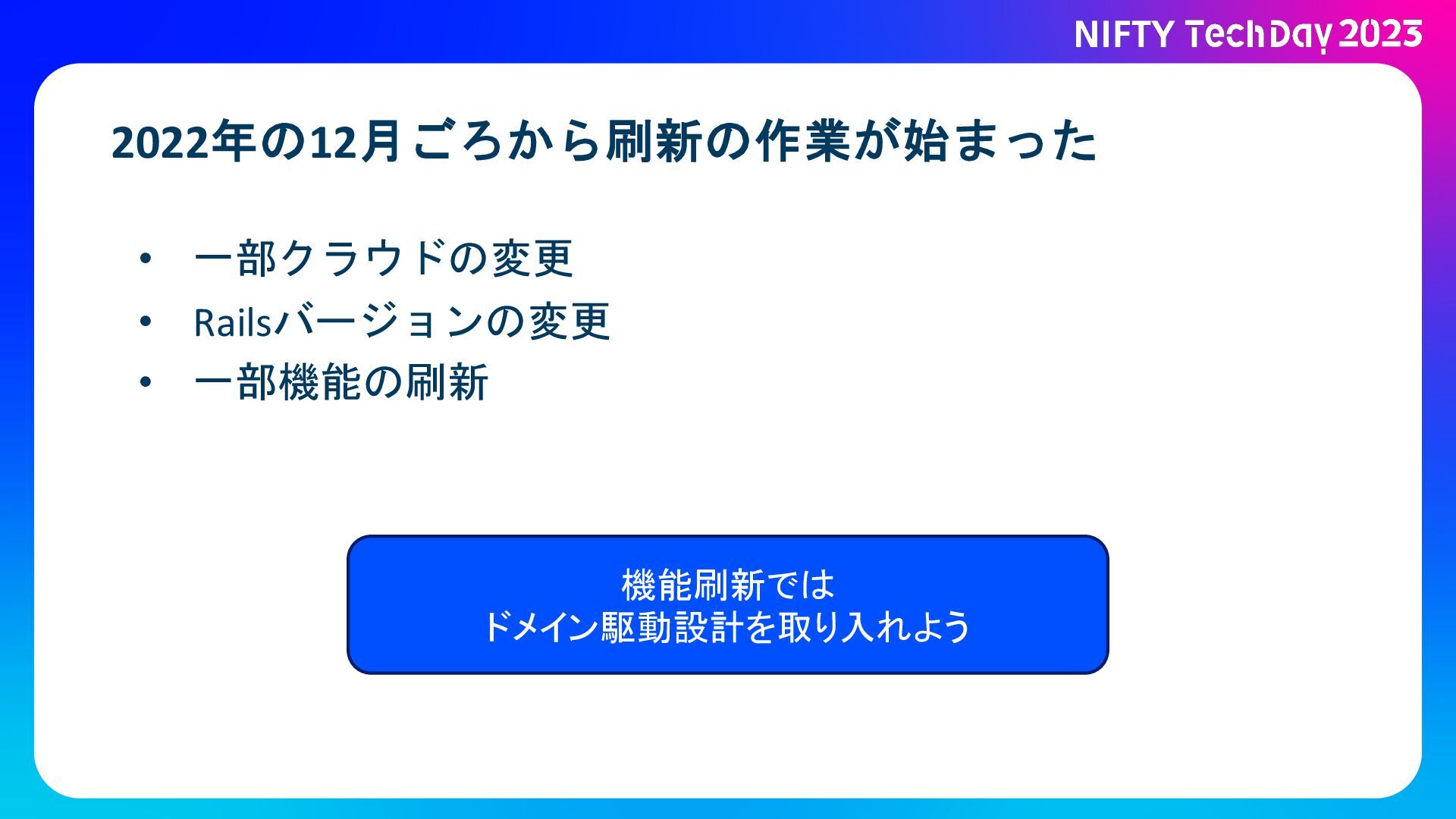 2022年の12月ごろから刷新の作業が始まった • 一部クラウドの変更 • Railsバージョンの変更 • 一部機能の刷新 機能刷新では ドメイン駆動設計を取り入れよう
