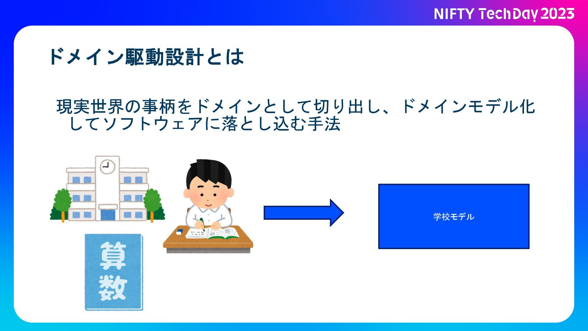 ドメイン駆動設計とは 現実世界の事柄をドメインとして切り出し、ドメインモデル化 してソフトウェアに落とし込む手法 学校モデル
