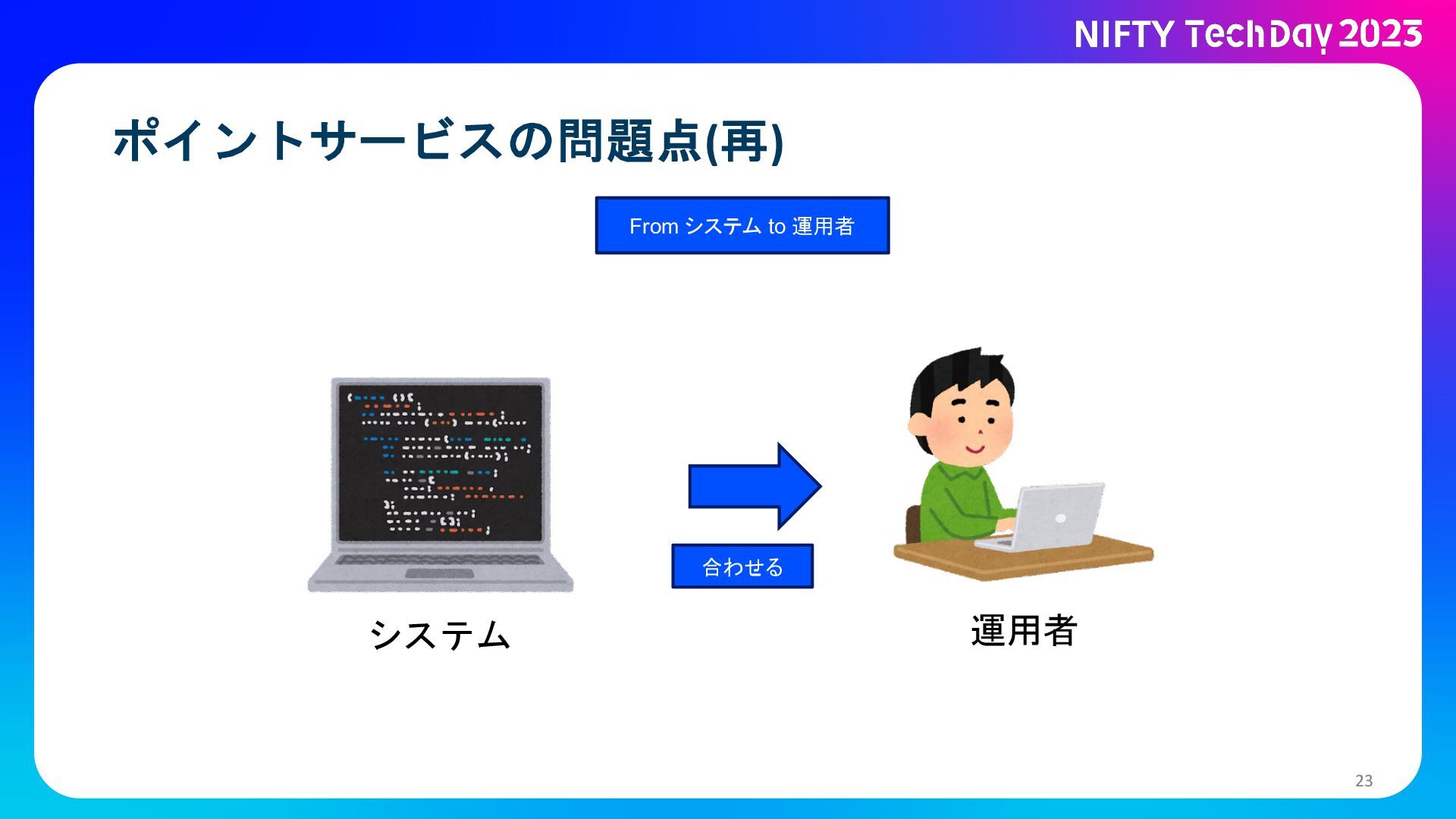 ポイントサービスの問題点(再) 23 システム 運用者 合わせる From システム to 運用者