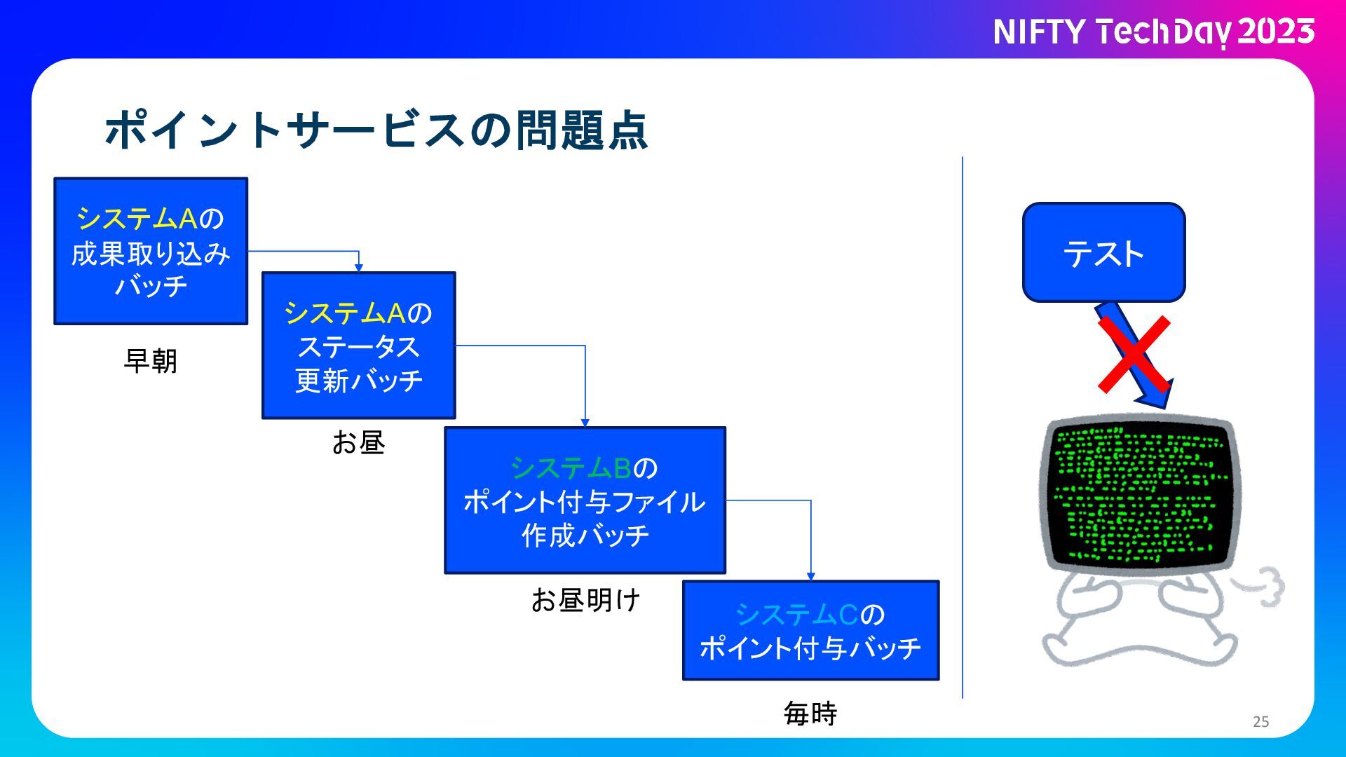 ポイントサービスの問題点 25 テスト システムAの 成果取り込み バッチ システムAの ステータス 更新バッチ システムBの