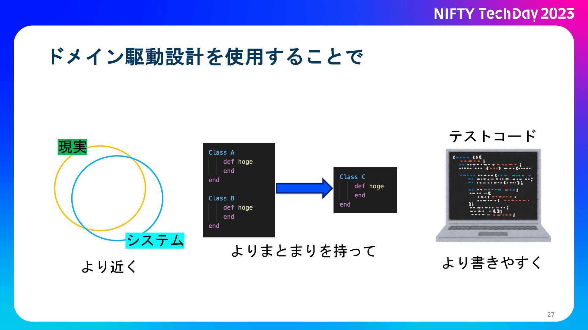 ドメイン駆動設計を使用することで 27 現実 システム より近く より書きやすく テストコード よりまとまりを持って
