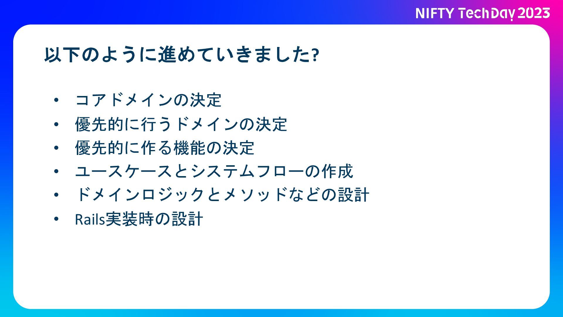 以下のように進めていきました? • コアドメインの決定 • 優先的に行うドメインの決定 • 優先的に作る機能の決定 • ユースケースとシステムフローの作成 •