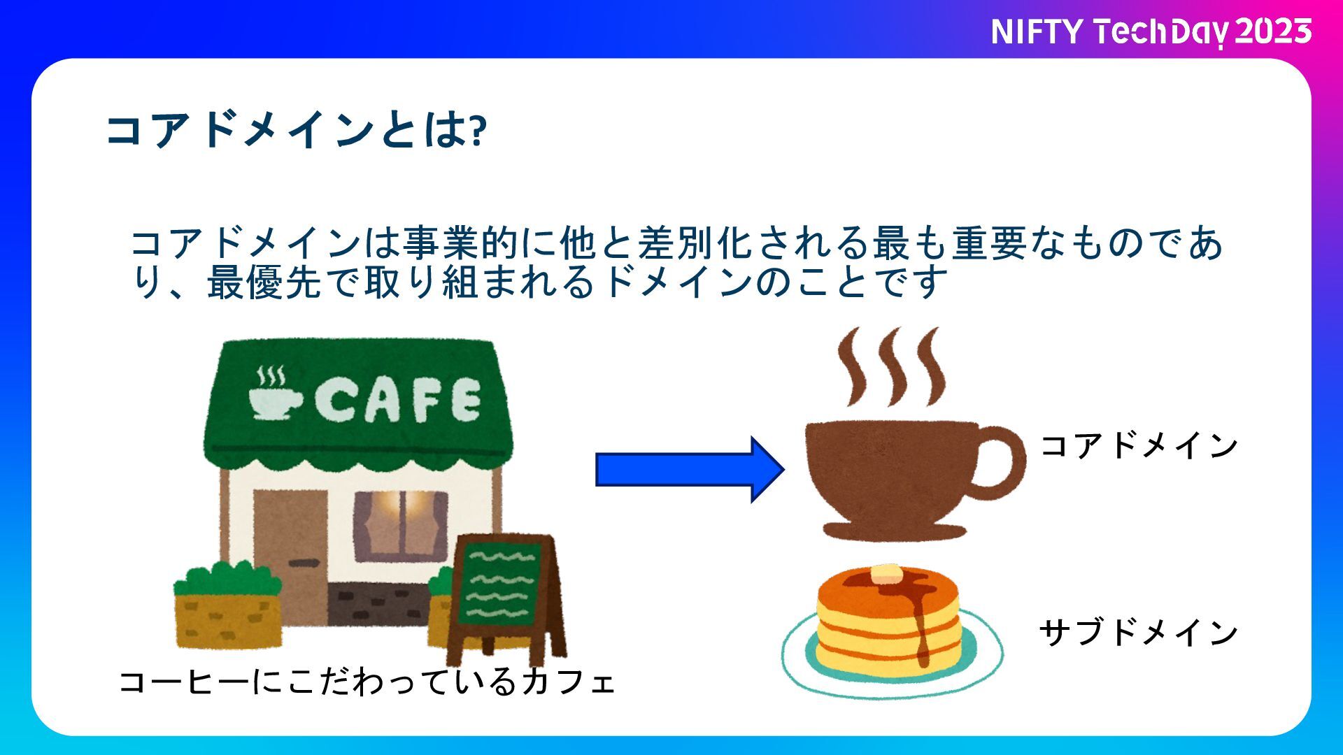 コアドメインとは? コアドメインは事業的に他と差別化される最も重要なものであ り、最優先で取り組まれるドメインのことです コーヒーにこだわっているカフェ コアドメイン サブドメイン