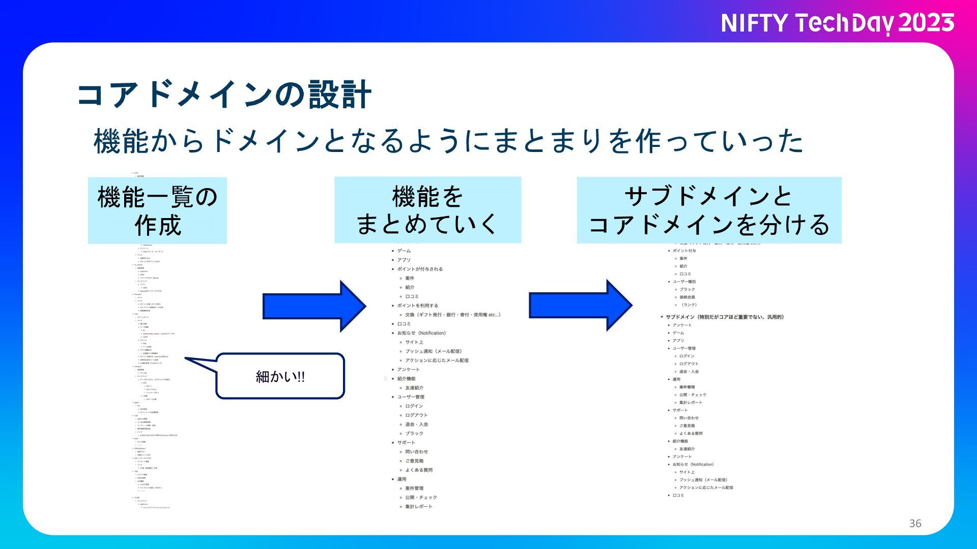 コアドメインの設計 36 機能からドメインとなるようにまとまりを作っていった 機能一覧の 作成 機能を まとめていく サブドメインと コアドメインを分ける 細かい!!