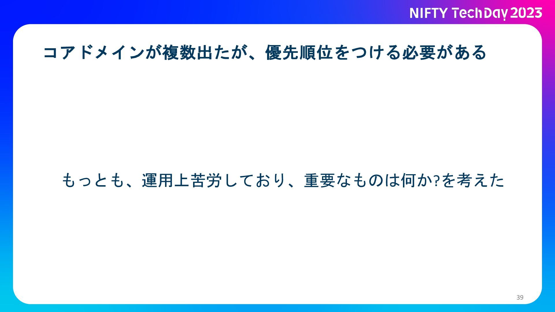 コアドメインが複数出たが、優先順位をつける必要がある 39 もっとも、運用上苦労しており、重要なものは何か?を考えた