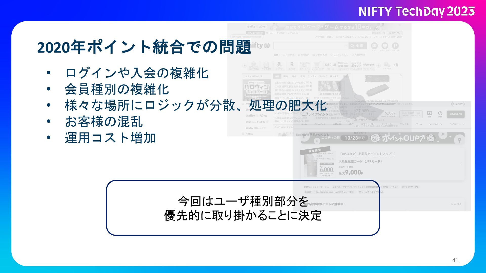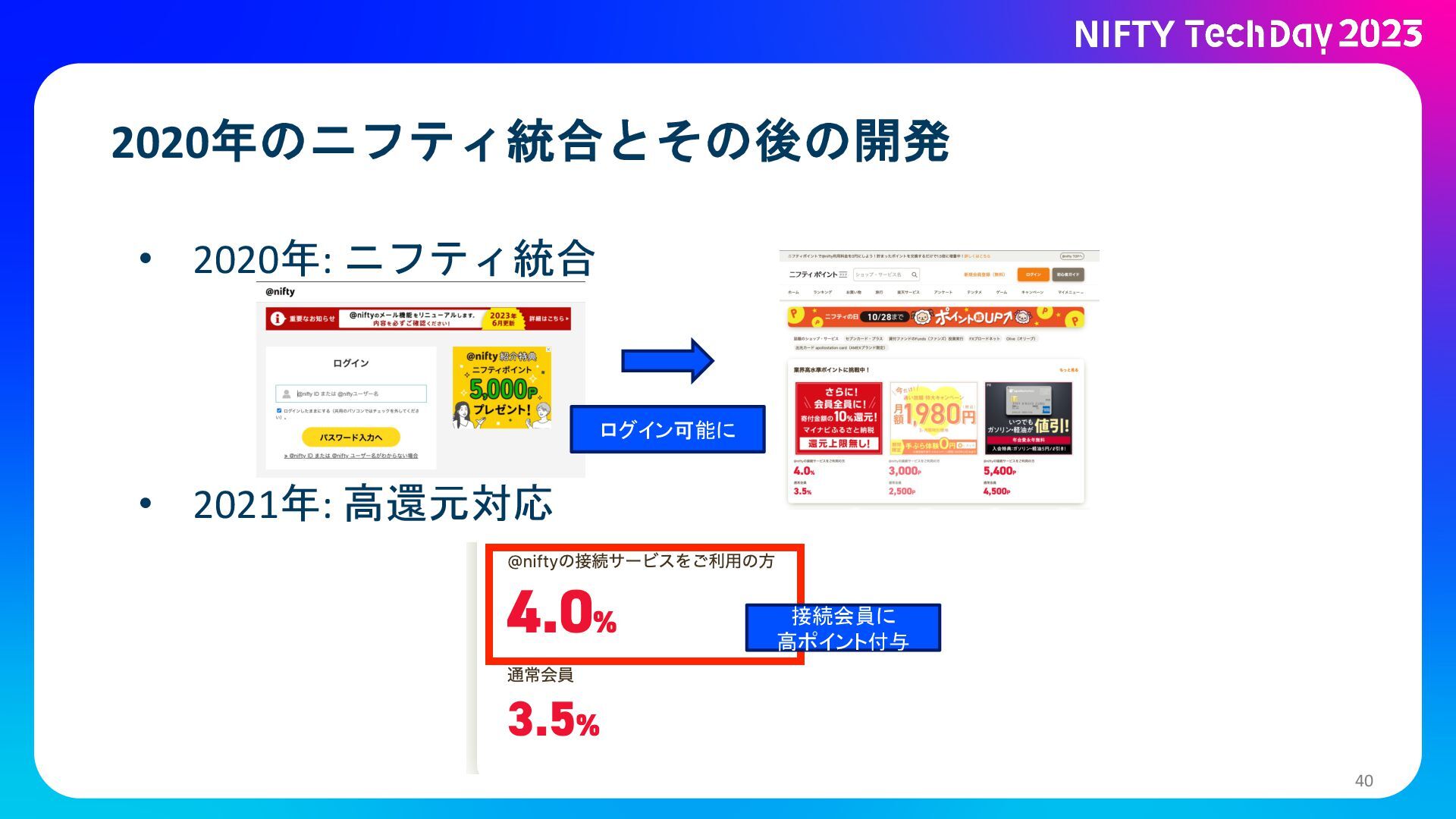 2020年のニフティ統合とその後の開発 40 • 2020年: ニフティ統合 • 2021年: 高還元対応 ログイン可能に 接続会員に