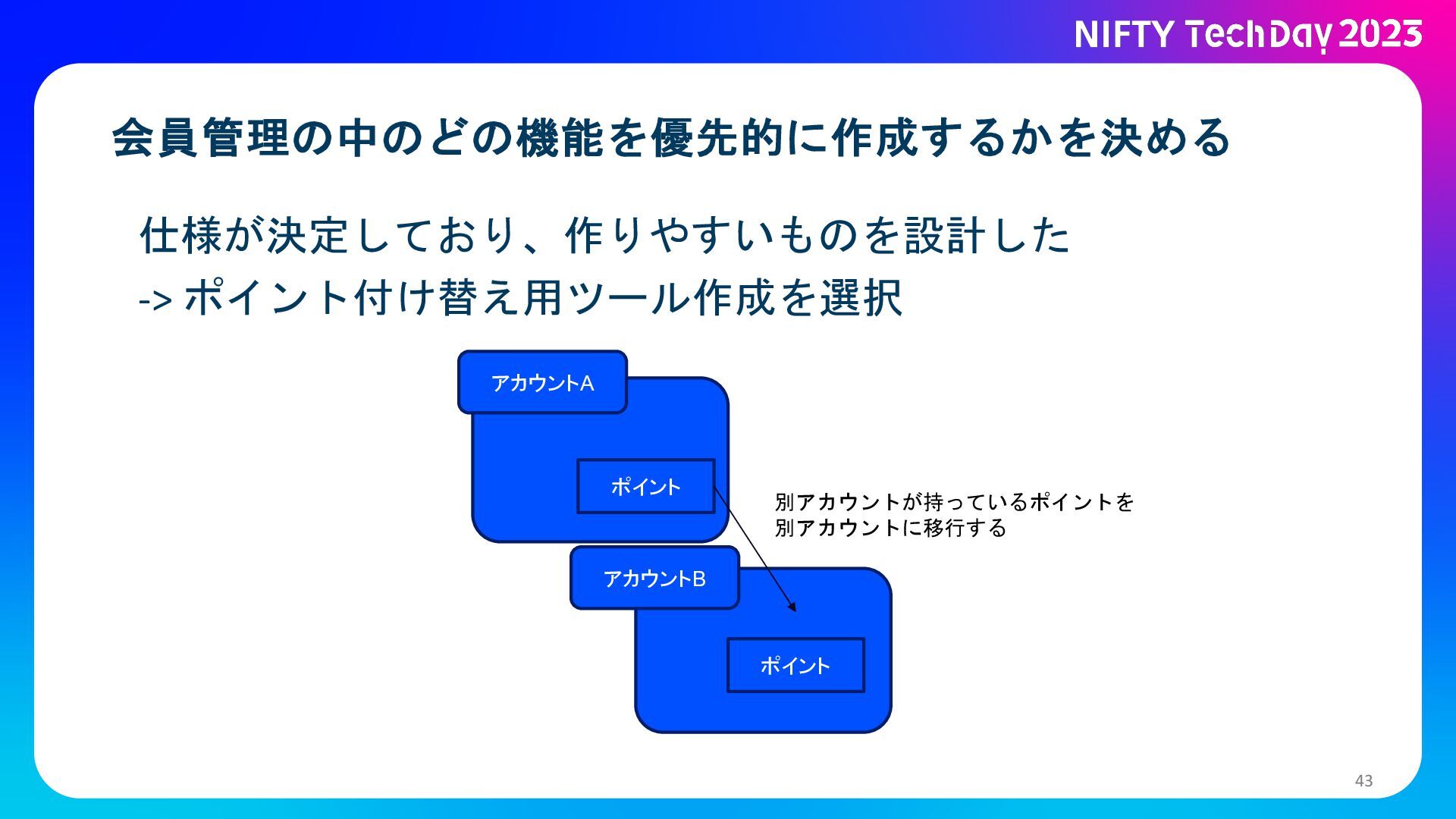 会員管理の中のどの機能を優先的に作成するかを決める 43 仕様が決定しており、作りやすいものを設計した -> ポイント付け替え用ツール作成を選択 ポイント アカウントA アカウントB ポイント 別アカウントが持っているポイントを