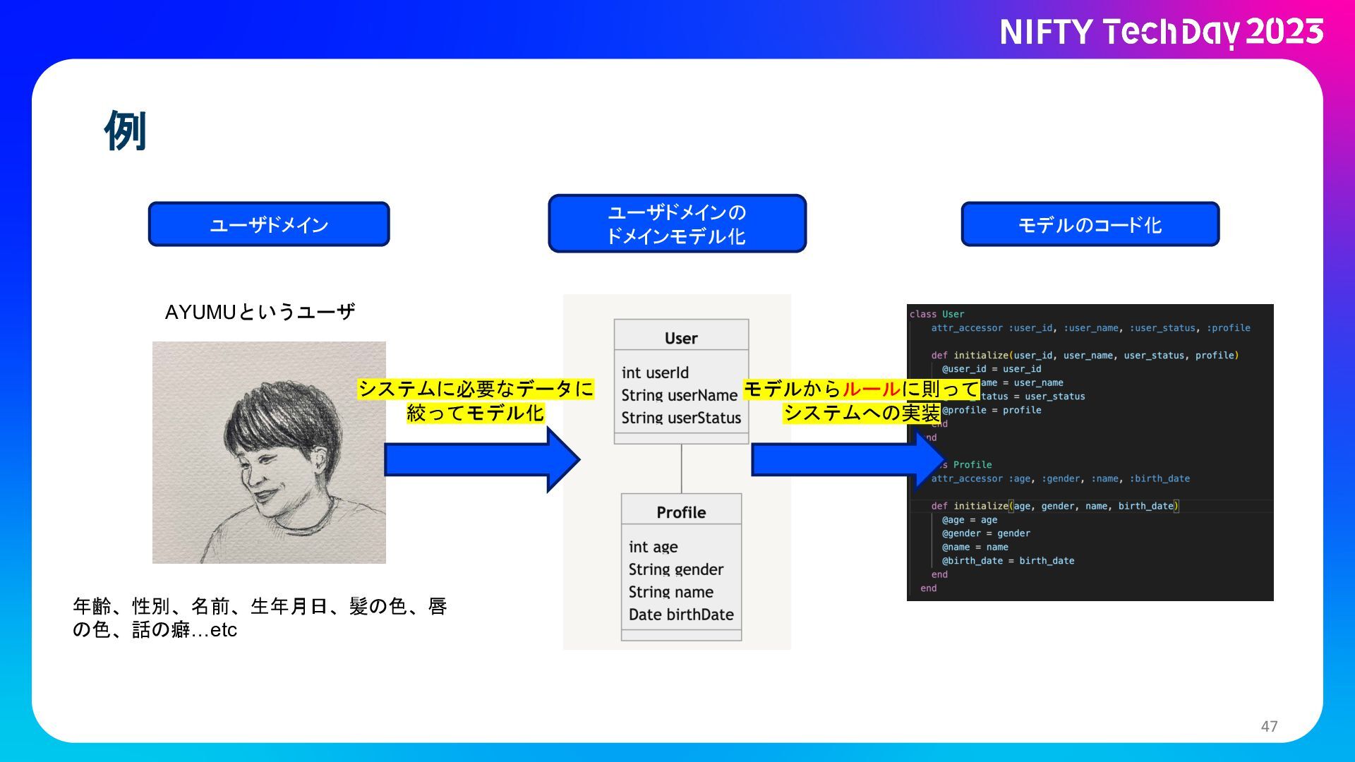 例 47 ユーザドメイン ユーザドメインの ドメインモデル化 モデルのコード化 AYUMUというユーザ 年齢、性別、名前、生年月日、髪の色、唇 の色、話の癖…etc システムに必要なデータに