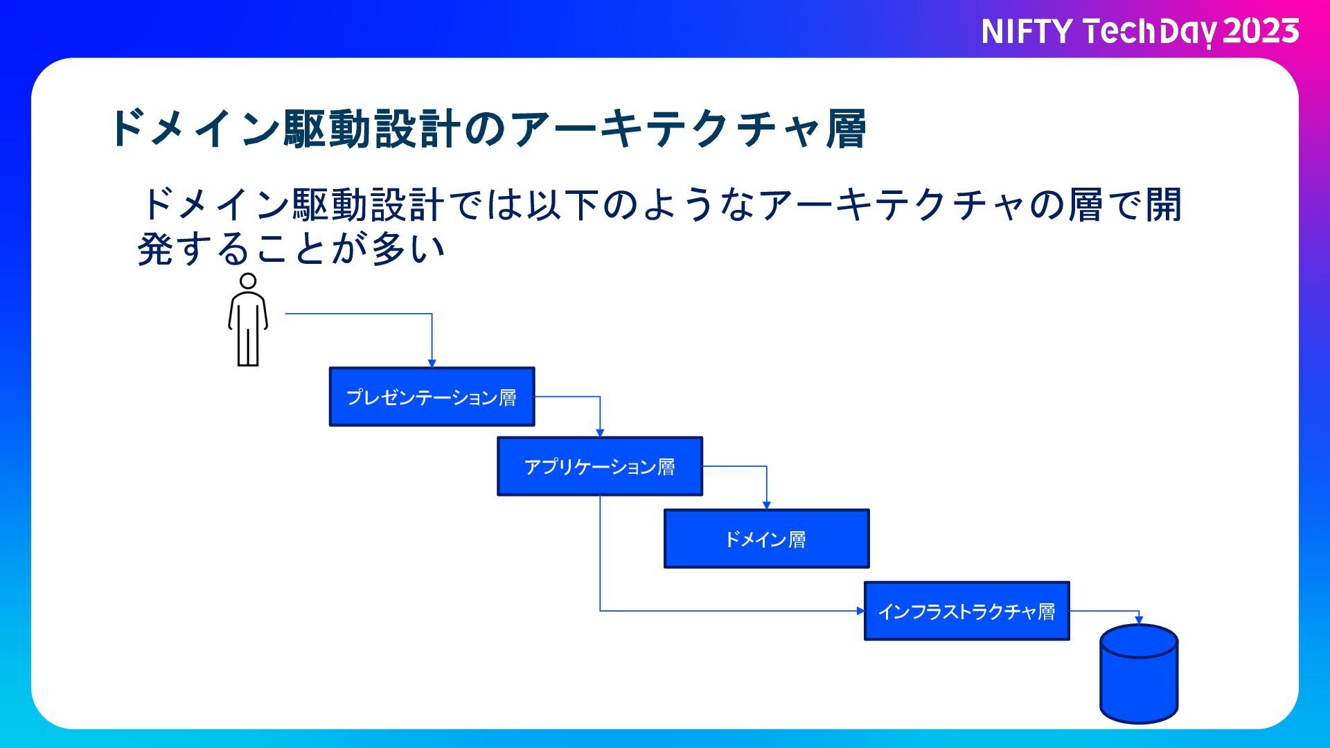 ドメイン駆動設計のアーキテクチャ層 ドメイン駆動設計では以下のようなアーキテクチャの層で開 発することが多い プレゼンテーション層 アプリケーション層 ドメイン層 インフラストラクチャ層