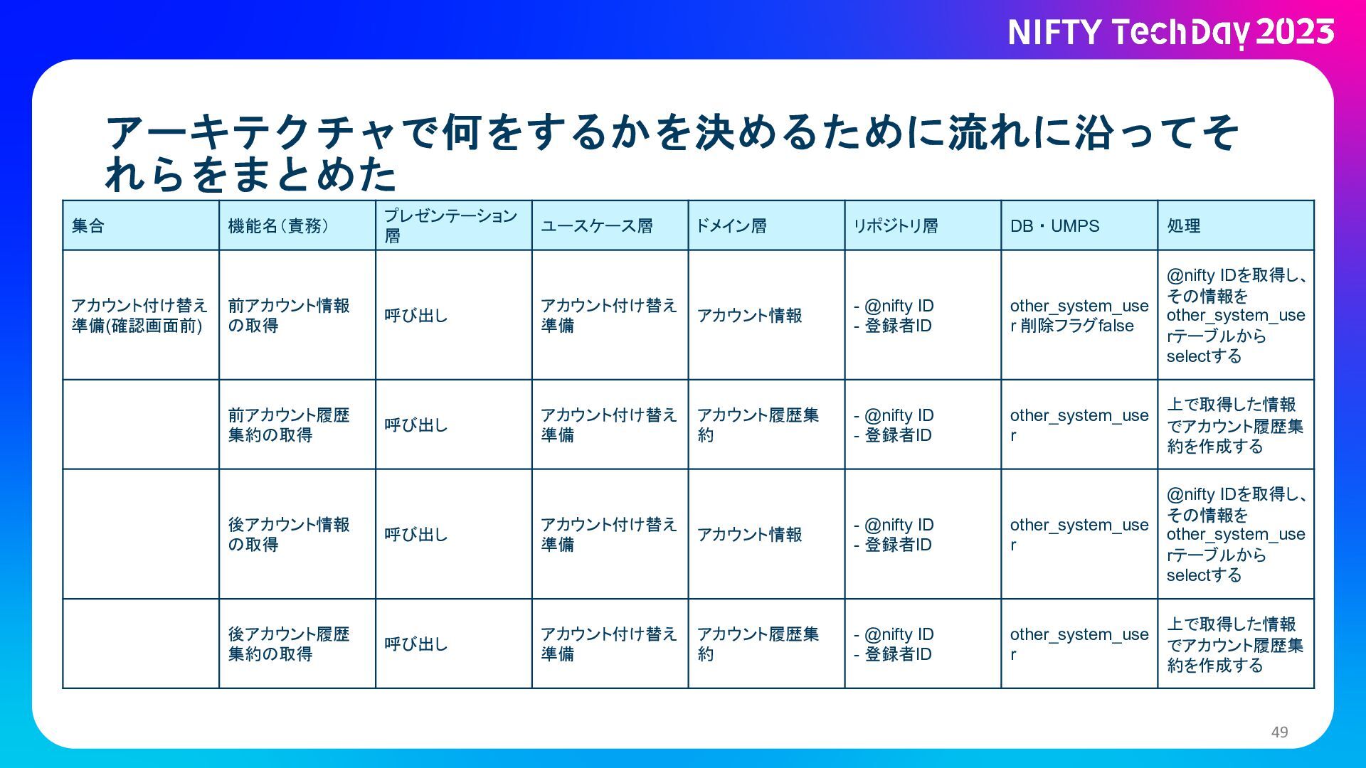 アーキテクチャで何をするかを決めるために流れに沿ってそ れらをまとめた 49 集合 機能名(責務) プレゼンテーション 層 ユースケース層 ドメイン層 リポジトリ層