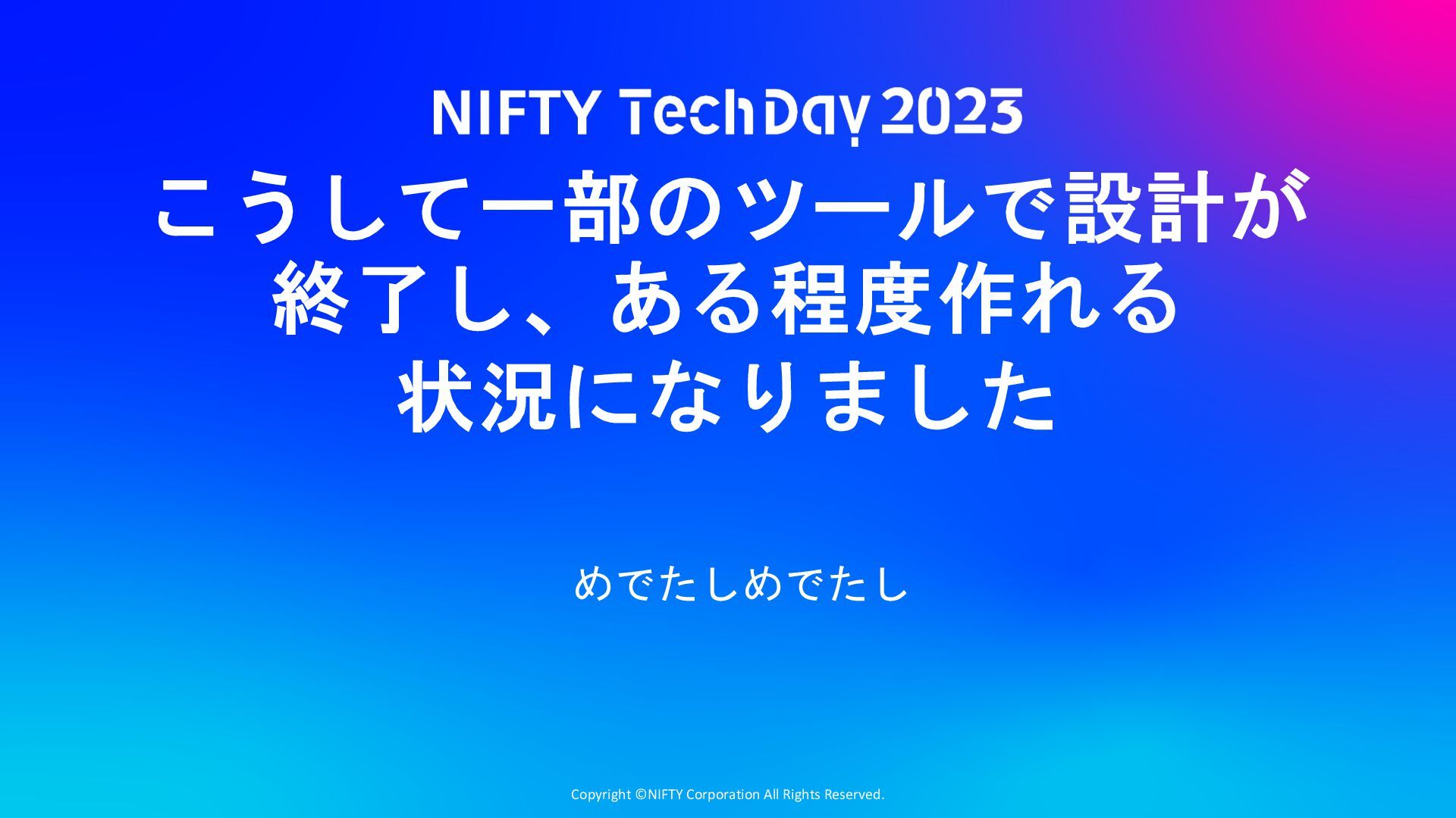 Copyright ©NIFTY Corporation All Rights Reserved. こうして一部のツールで設計が 終了し、ある程度作れる 状況になりました めでたしめでたし