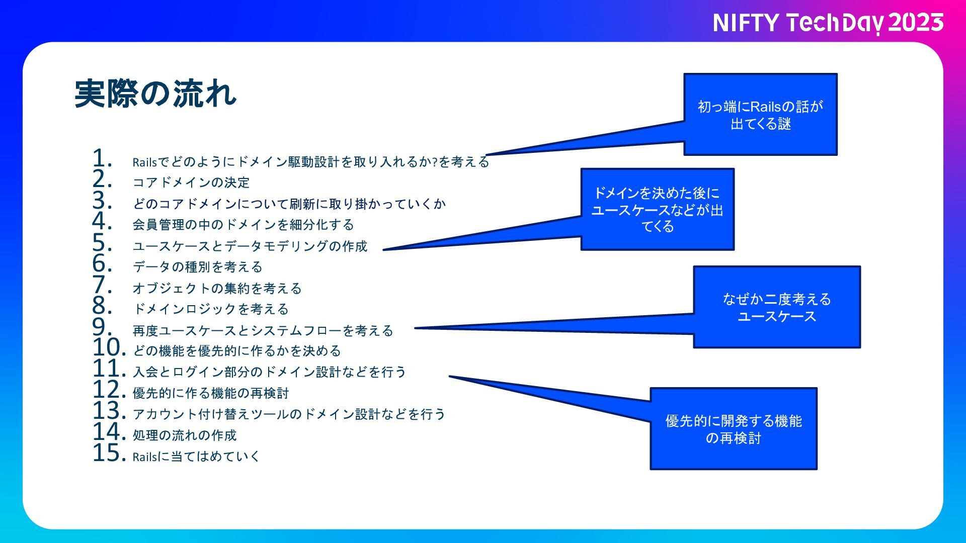 ユースケースとデータモデリングの作成 6. データの種別を考える 7. オブジェクトの集約を考える 8. ドメインロジックを考える 9. 再度ユースケースとシステムフローを考える 10. どの機能を優先的に作るかを決める 11. 入会とログイン部分のドメイン設計などを行う 12. 優先的に作る機能の再検討 13. アカウント付け替えツールのドメイン設計などを行う 14. 処理の流れの作成 15. Railsに当てはめていく なぜか二度考える ユースケース ドメインを決めた後に ユースケースなどが出 てくる 優先的に開発する機能 の再検討 初っ端にRailsの話が 出てくる謎