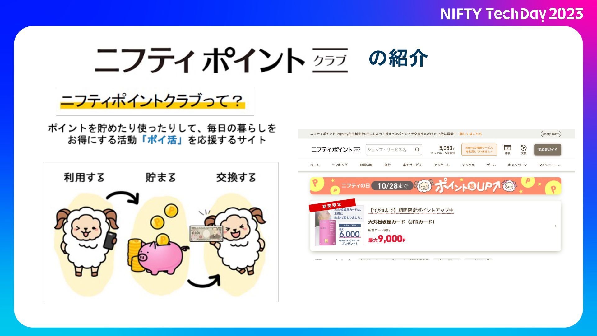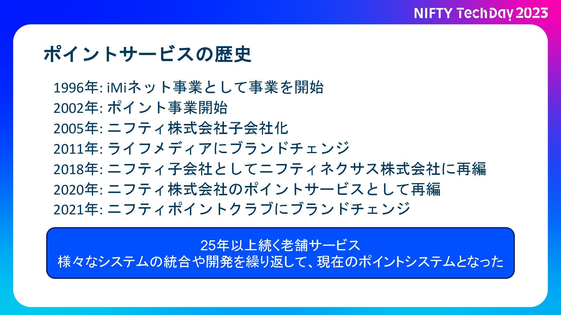 ニフティ子会社としてニフティネクサス株式会社に再編 2020年: ニフティ株式会社のポイントサービスとして再編 2021年: ニフティポイントクラブにブランドチェンジ 25年以上続く老舗サービス 様々なシステムの統合や開発を繰り返して、現在のポイントシステムとなった
