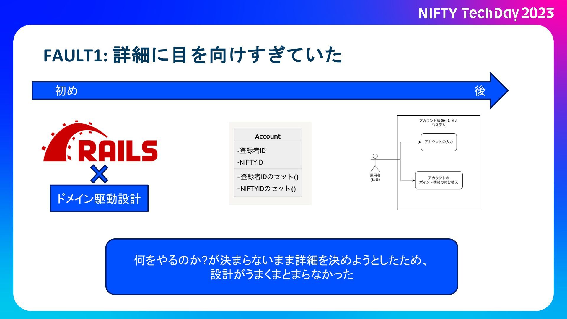 FAULT1: 詳細に目を向けすぎていた 何をやるのか?が決まらないまま詳細を決めようとしたため、 設計がうまくまとまらなかった ドメイン駆動設計 初め 後