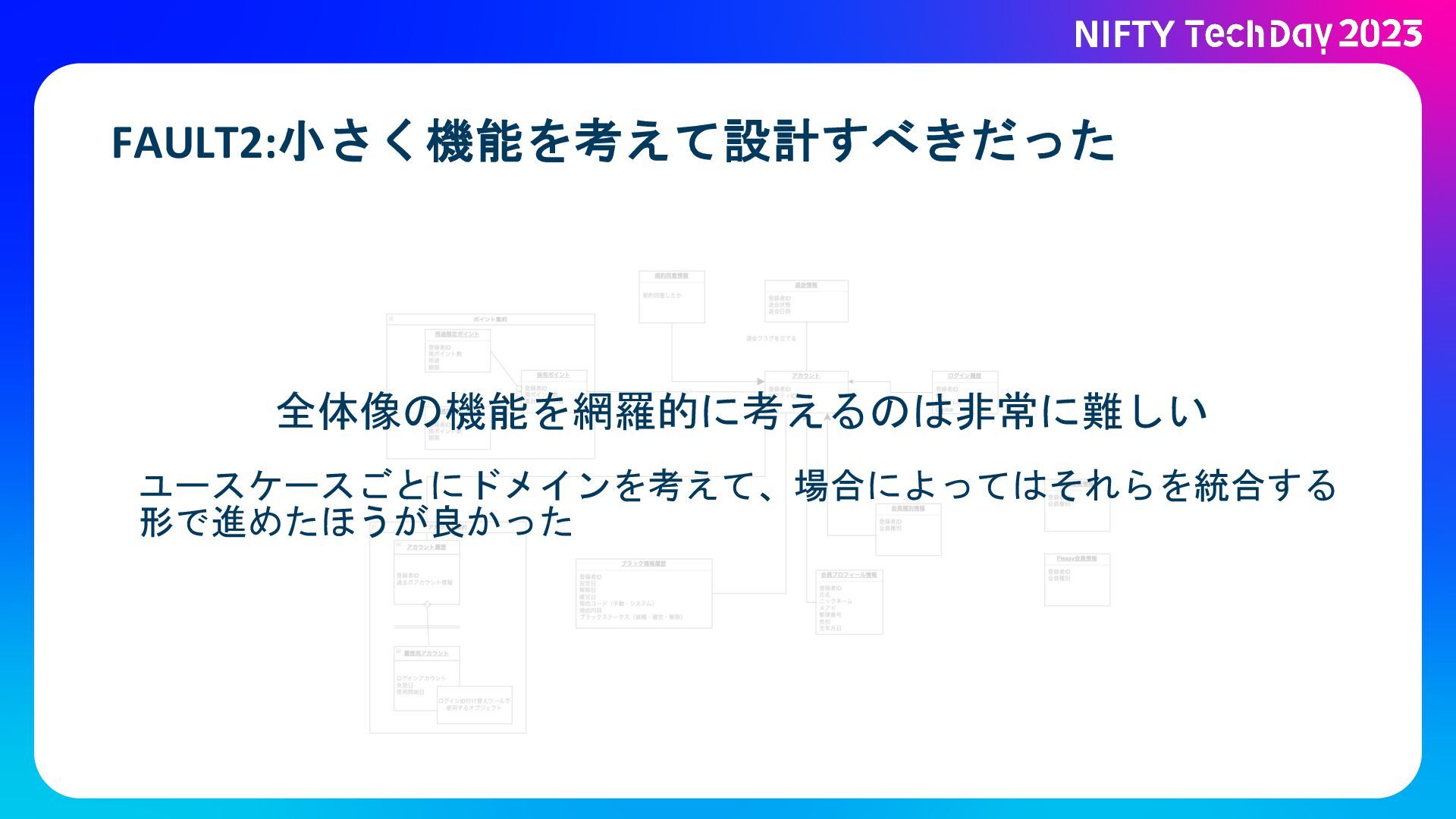 FAULT2:小さく機能を考えて設計すべきだった 全体像の機能を網羅的に考えるのは非常に難しい ユースケースごとにドメインを考えて、場合によってはそれらを統合する 形で進めたほうが良かった