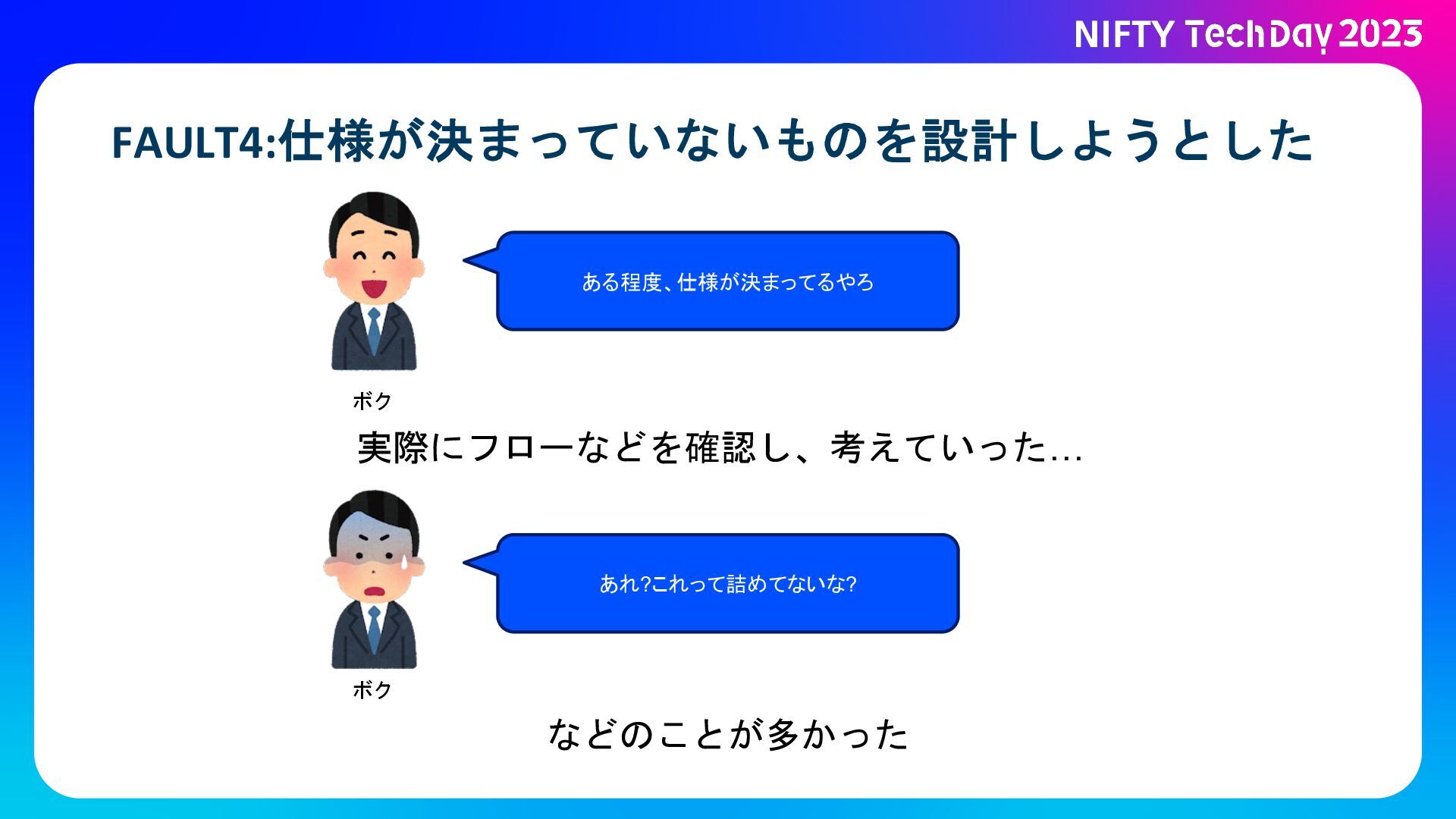 FAULT4:仕様が決まっていないものを設計しようとした ボク ある程度、仕様が決まってるやろ 実際にフローなどを確認し、考えていった… ボク あれ?これって詰めてないな? などのことが多かった