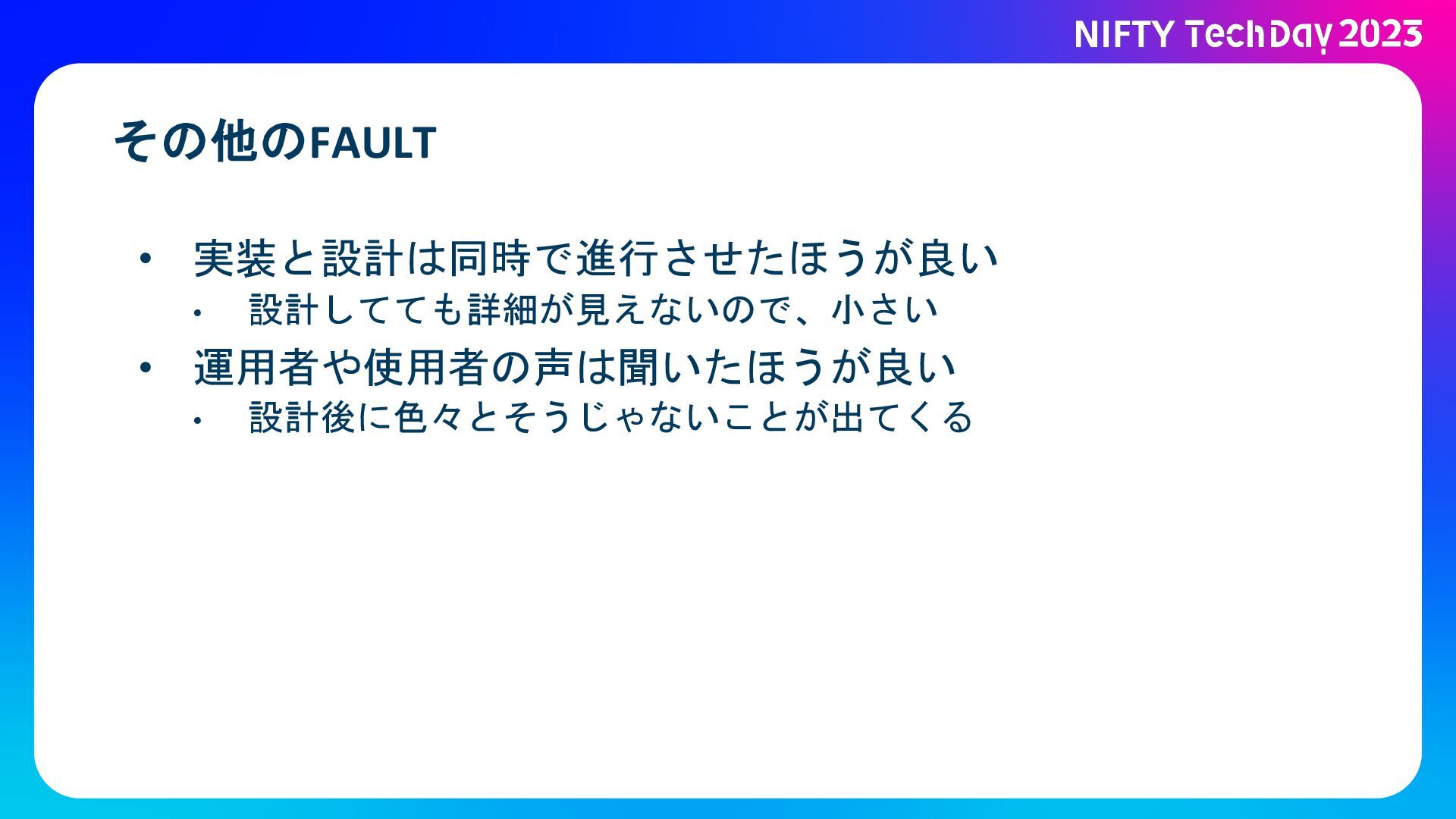 その他のFAULT • 実装と設計は同時で進行させたほうが良い • 設計してても詳細が見えないので、小さい • 運用者や使用者の声は聞いたほうが良い • 設計後に色々とそうじゃないことが出てくる