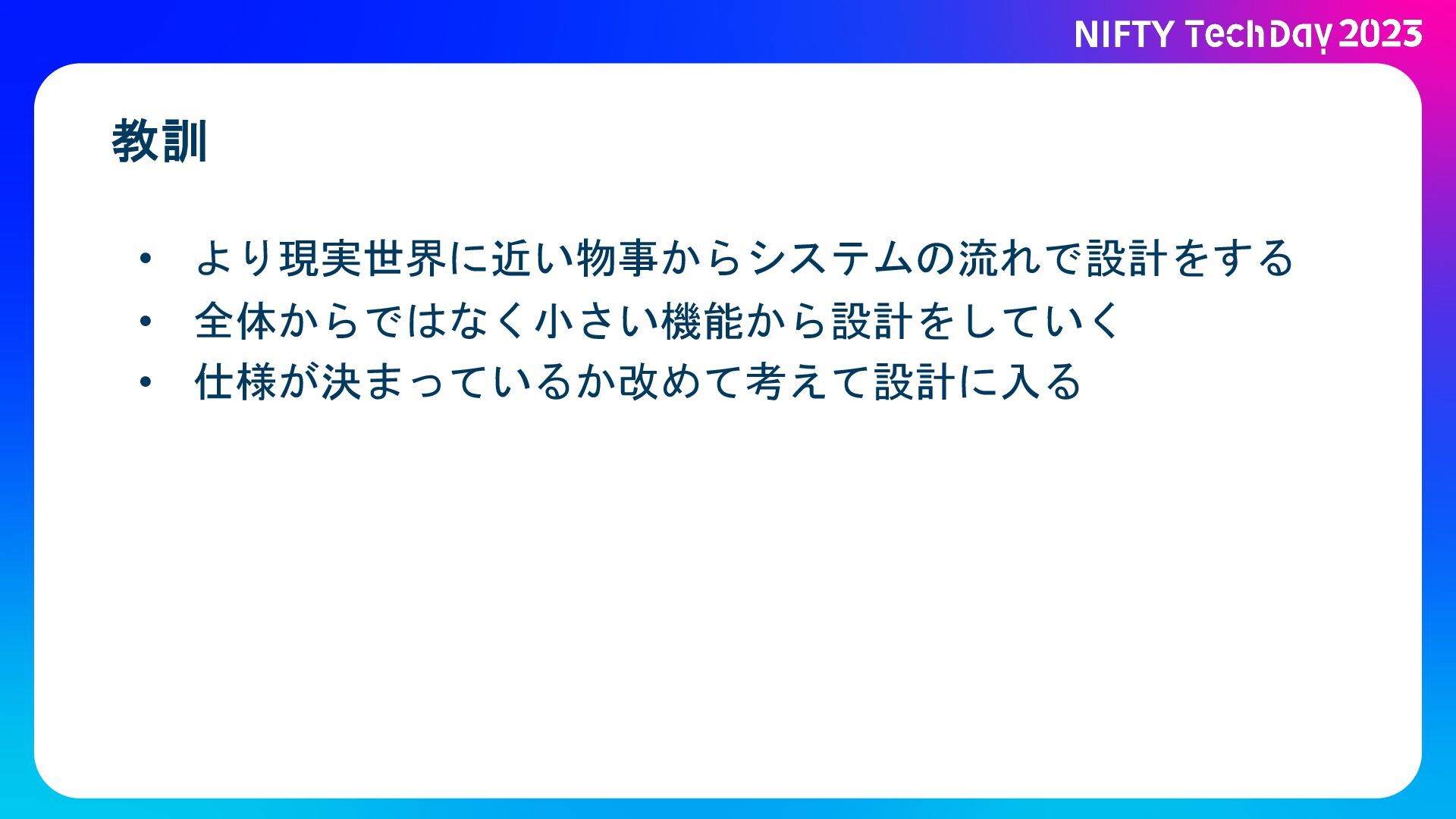 教訓 • より現実世界に近い物事からシステムの流れで設計をする • 全体からではなく小さい機能から設計をしていく • 仕様が決まっているか改めて考えて設計に入る