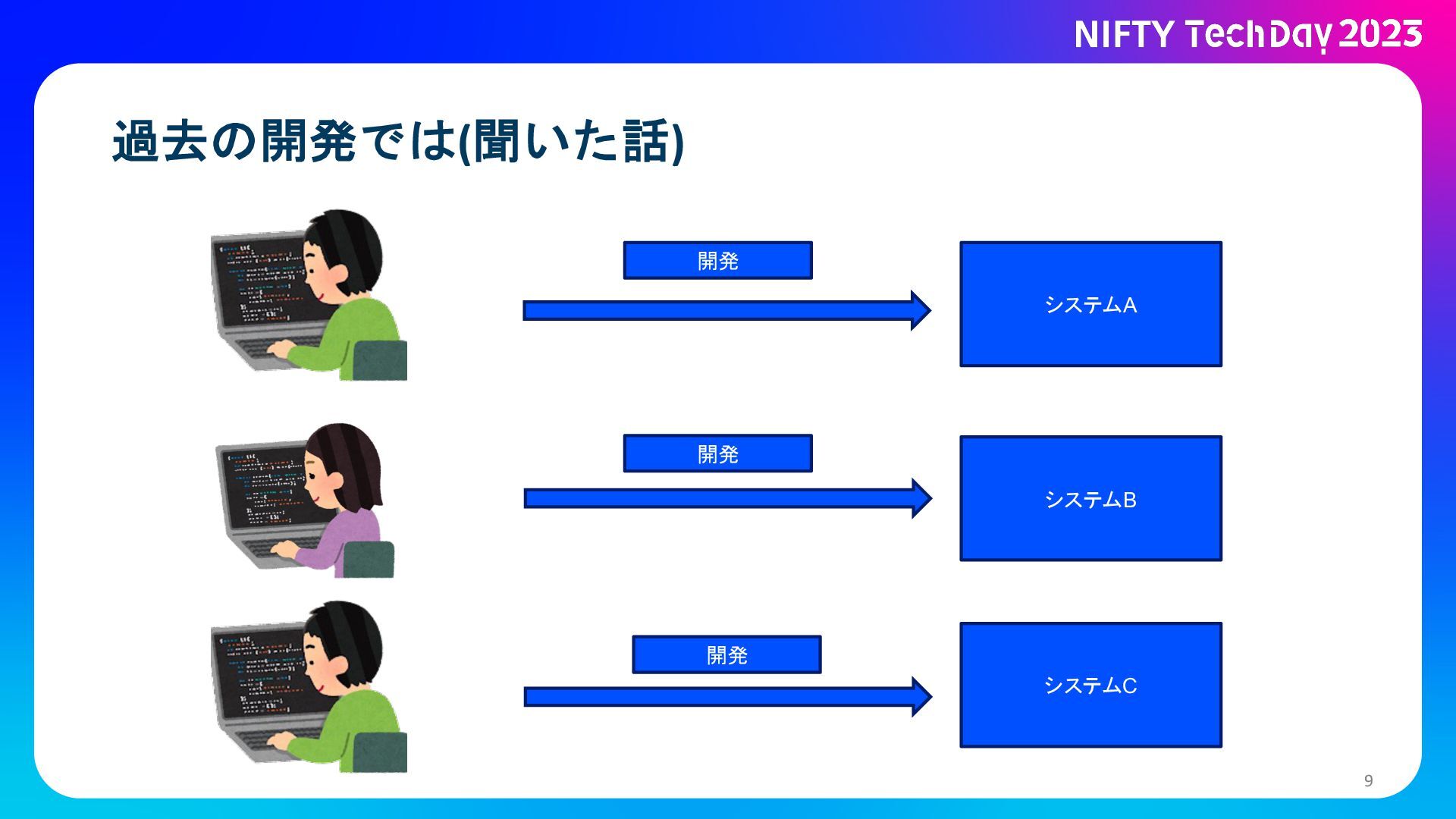 過去の開発では(聞いた話) 10 システムA システムB システムC 開発 開発 開発 システム間に共通のルールはなし 各々が各々で好きなように機能開発し
