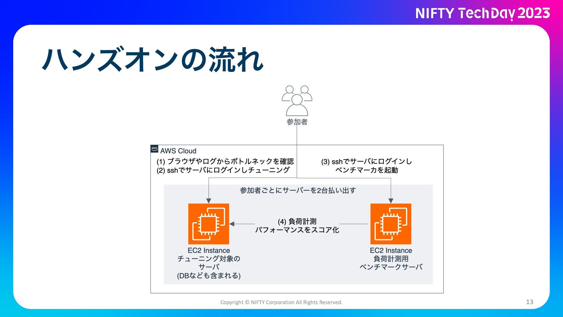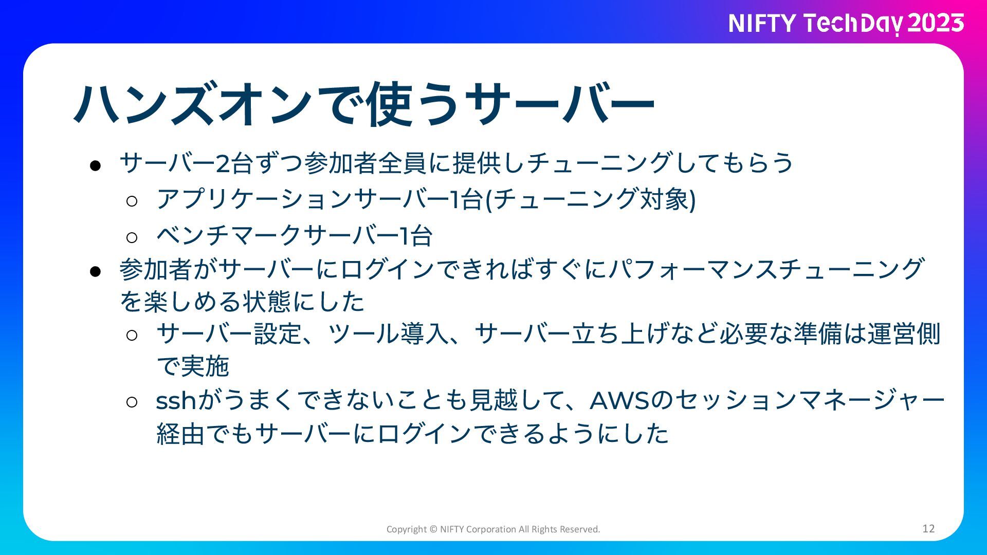 αʔόʔ2ͣͭࢀՃऀશһʹఏڙ͠νϡʔχϯάͯ͠Β͏ ◦ ΞϓϦέʔγϣϯαʔόʔ1(νϡʔχϯάର) ◦ ϕϯνϚʔΫαʔόʔ1 • ࢀՃऀ͕αʔόʔʹϩάΠϯͰ͖Ε͙͢ʹύϑΥʔϚϯενϡʔχϯά Λָ͠ΊΔঢ়ଶʹͨ͠ ◦ αʔόʔઃఆɺπʔϧಋೖɺαʔόʔ্ཱͪ͛ͳͲඞཁͳ४උӡӦଆ Ͱ࣮ࢪ ◦ ssh͕͏·͘Ͱ͖ͳ͍͜ͱݟӽͯ͠ɺAWSͷηογϣϯϚωʔδϟʔ ܦ༝ͰαʔόʔʹϩάΠϯͰ͖ΔΑ͏ʹͨ͠