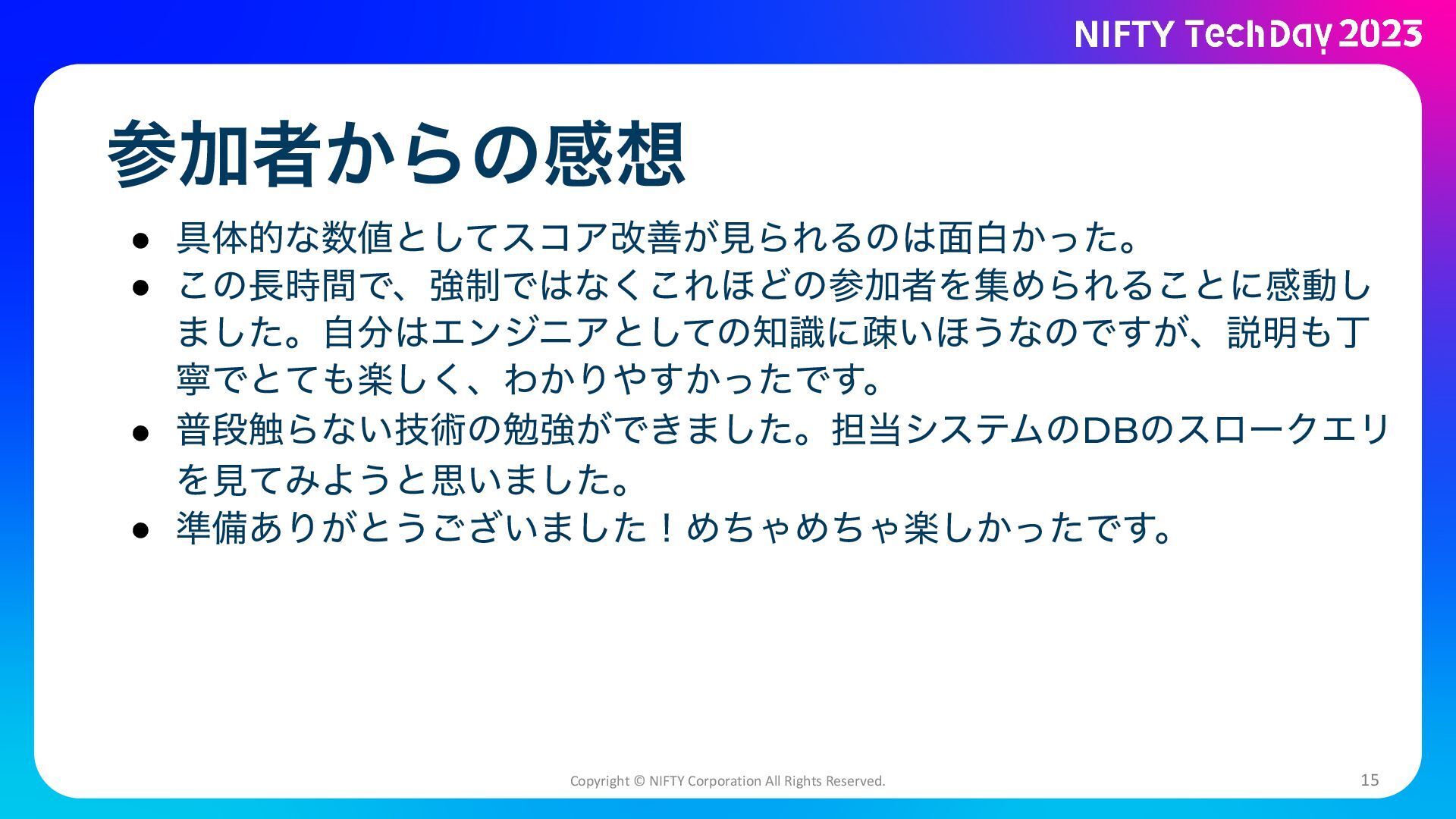Copyright © NIFTY Corporation All Rights Reserved. ࢀՃऀ͔Βͷײ 15 •