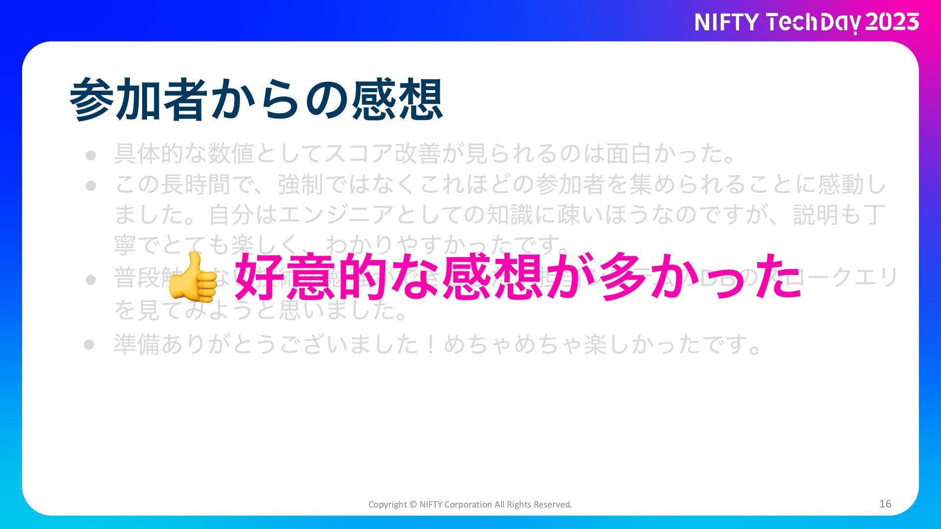 Copyright © NIFTY Corporation All Rights Reserved. ࢀՃऀ͔Βͷײ 16 •