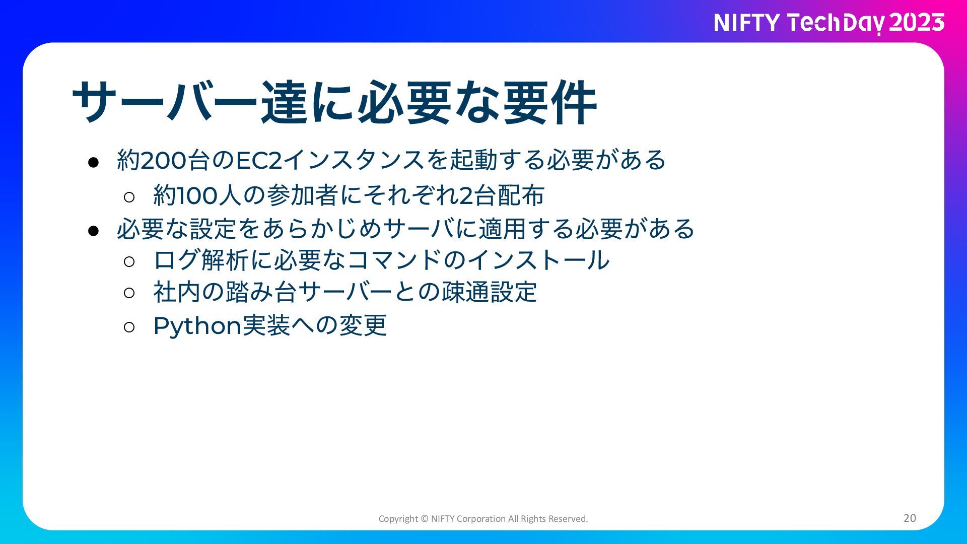 200ͷEC2ΠϯελϯεΛىಈ͢Δඞཁ͕͋Δ ◦ 100ਓͷࢀՃऀʹͦΕͧΕ2 • ඞཁͳઃఆΛ͋Β͔͡Ίαʔόʹద༻͢Δඞཁ͕͋Δ ◦ ϩάղੳʹඞཁͳίϚϯυͷΠϯετʔϧ ◦ ࣾͷ౿Έαʔόʔͱͷૄ௨ઃఆ ◦ Python࣮ͷมߋ