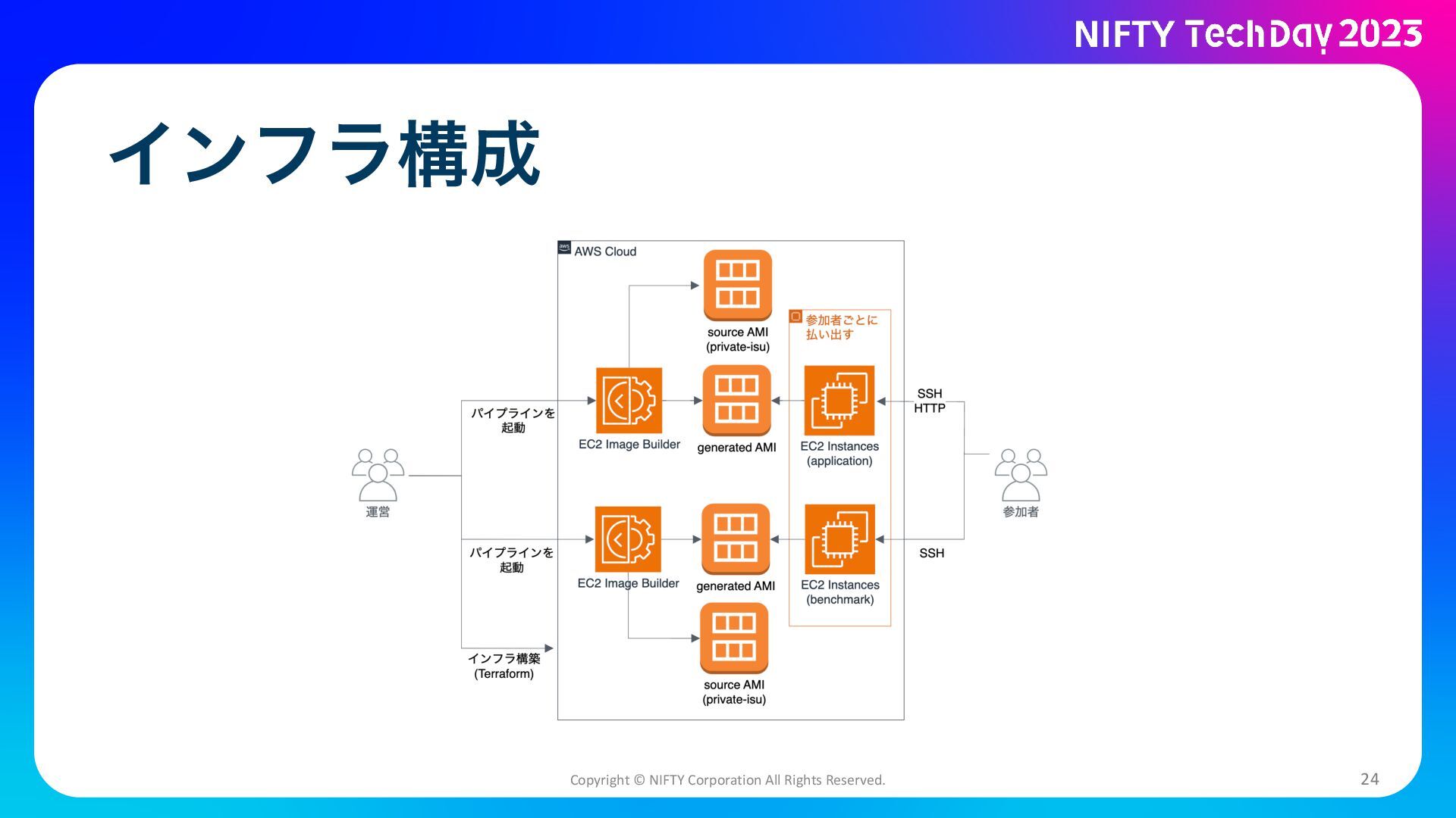 ेʹݕূΛߦͳ͍ͬͯͨͨΊɺΠϕϯτͷਐߦ͕ࢭ·ΔΑ͏ͳେ͖ͳ ͕ى͖Δ͜ͱͳ͔ͬͨ ◦ TerraformEC2 Image BuilderΛͬͯAMIΛ࡞͍ͯͨͨ͠Ίɺ ͏·͘ಈ͘ঢ়ଶΛ؆୯ʹ࠶ݱͰ͖ͨɻ • લͷࢀՃऀՃʹରԠ ◦ TerraformͷcountΛͬͯΠϯελϯεΛෳ࡞ΔΑ͏ʹ͍ͯͨ͠ͷ ͰɺࣈΛ૿͚ͩ͢Ͱ͙͢ʹରԠͰ͖ͨ • ϩʔΧϧPCͷڥཁҼͰsshͰ͖ͳ͍ࢀՃऀ͕ਓ͍ͨ ◦ AWSͷίϯιʔϧ͔ΒηογϣϯϚωʔδϟܦ༝ͰϩάΠϯ͢ΔΑ͏