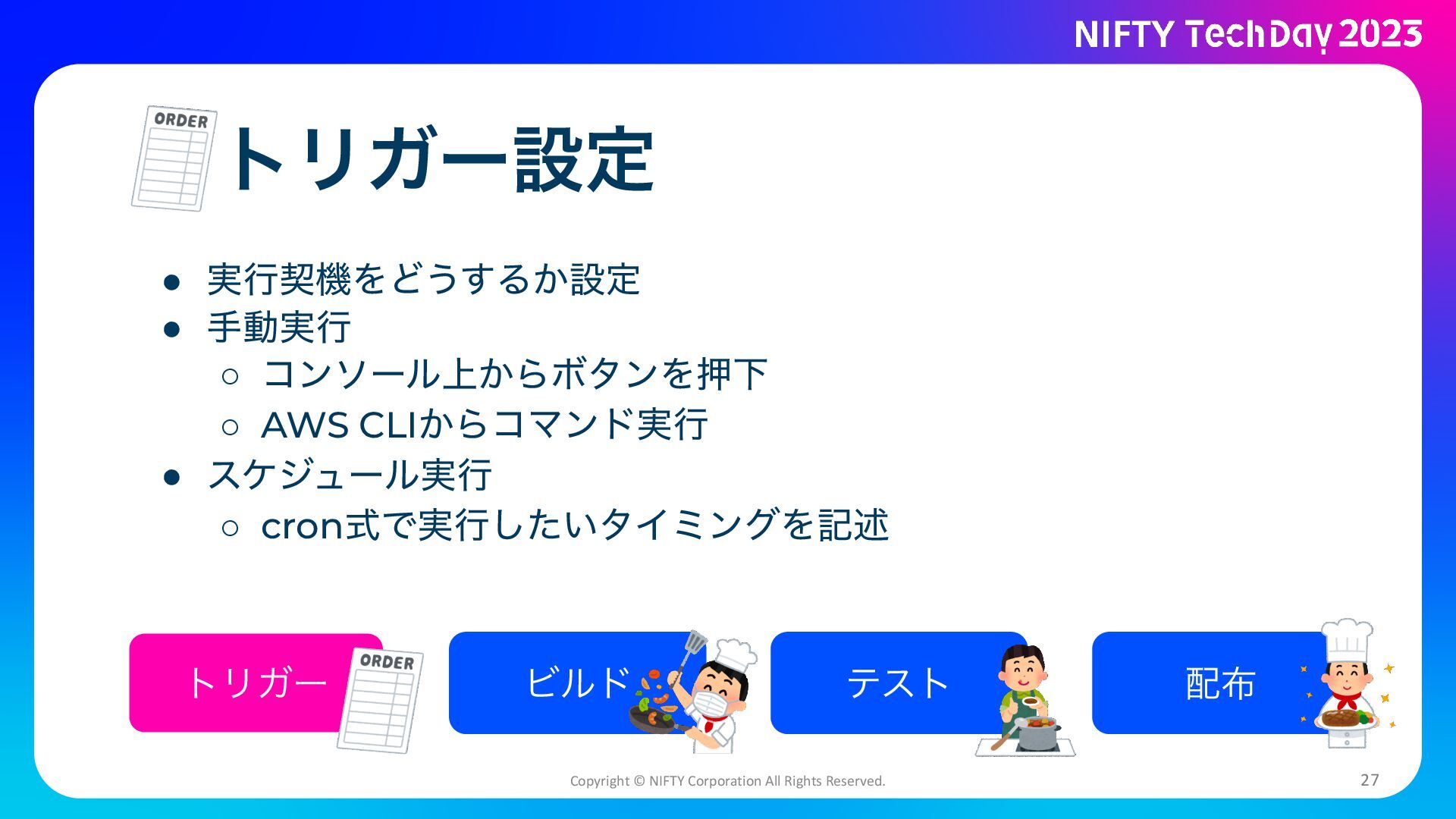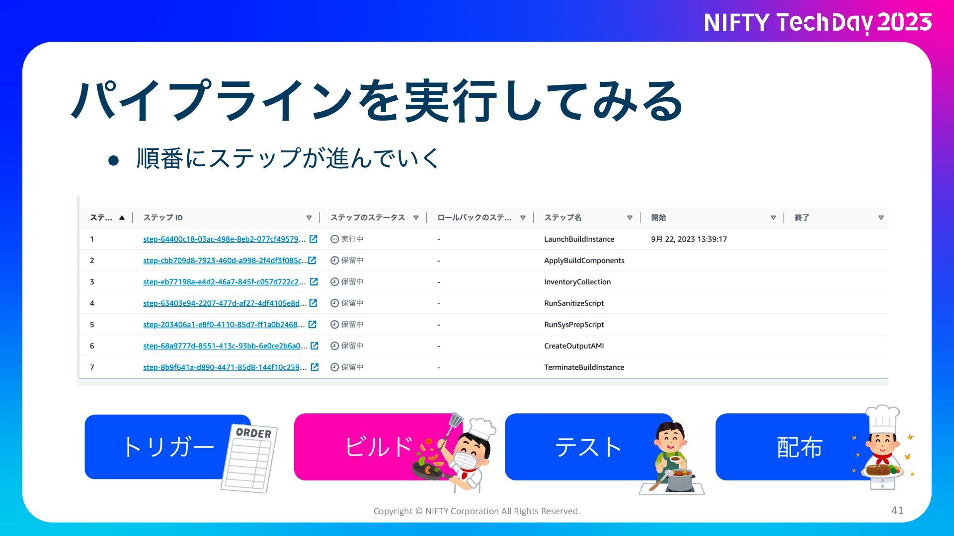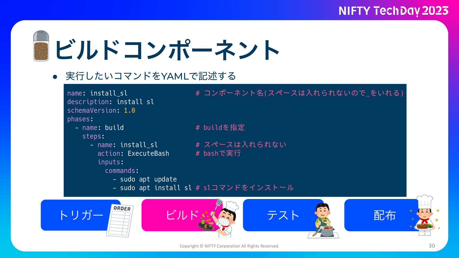 Corporation All Rights Reserved. ςετίϯϙʔωϯτ Copyright © NIFTY Corporation All Rights Reserved. 36 • ςετ͍ͨ͠ίϚϯυΛهड़͢Δ 36 τϦΨʔ Ϗϧυ ςετ name: install_sl # 半角スペースの代わりに_を入れる description: install sl schemaVersion: 1.0 - name: test # testを入れるとテストしてくれる steps: - name: run_sl # 半角スペースの代わりに_を入れる action: ExecuteBash # bashで実行 inputs: commands: - which sl # slコマンドの存在を確認