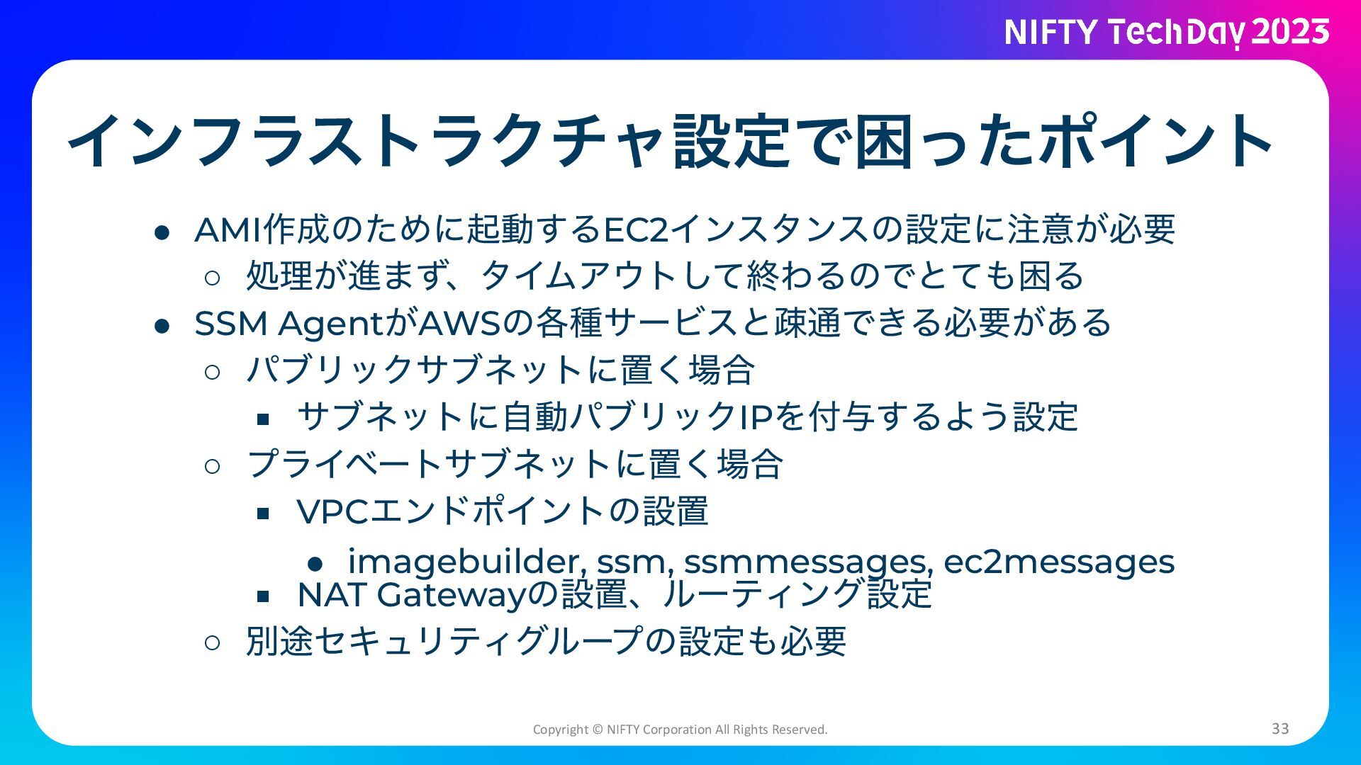 AMI࡞ͷͨΊʹىಈ͢ΔEC2Πϯελϯεͷઃఆʹҙ͕ඞཁ ◦ ॲཧ͕ਐ·ͣɺλΠϜΞτͯ͠ऴΘΔͷͰͱͯࠔΔ • SSM Agent͕AWSͷ֤छαʔϏεͱૄ௨Ͱ͖Δඞཁ͕͋Δ ◦ ύϒϦοΫαϒωοτʹஔ͘߹ ▪ αϒωοτʹࣗಈύϒϦοΫIPΛ༩͢ΔΑ͏ઃఆ ◦ ϓϥΠϕʔταϒωοτʹஔ͘߹ ▪ VPCΤϯυϙΠϯτͷઃஔ • imagebuilder, ssm, ssmmessages, ec2messages ▪ NAT GatewayͷઃஔɺϧʔςΟϯάઃఆ ◦ ผ్ηΩϡϦςΟάϧʔϓͷઃఆඞཁ
