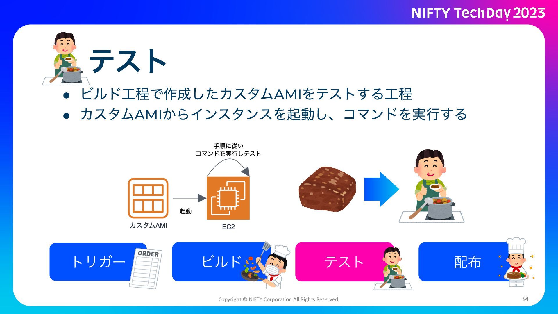 Corporation All Rights Reserved. ςετઃఆ Copyright © NIFTY Corporation All Rights Reserved. 35 ΠϯϑϥετϥΫνϟઃఆ AMIΛςετ͢ΔͨΊʹىಈ͢ΔEC2Πϯελϯεͷઃఆ (Ϗϧυͱڞ௨) Ϩγϐ (Ϗϧυͱڞ௨) ςετίϯϙʔωϯτ YAMLܗࣜͰ࣮ߦ͍ͨ͠ίϚϯυΛهड़ 35 τϦΨʔ Ϗϧυ ςετ