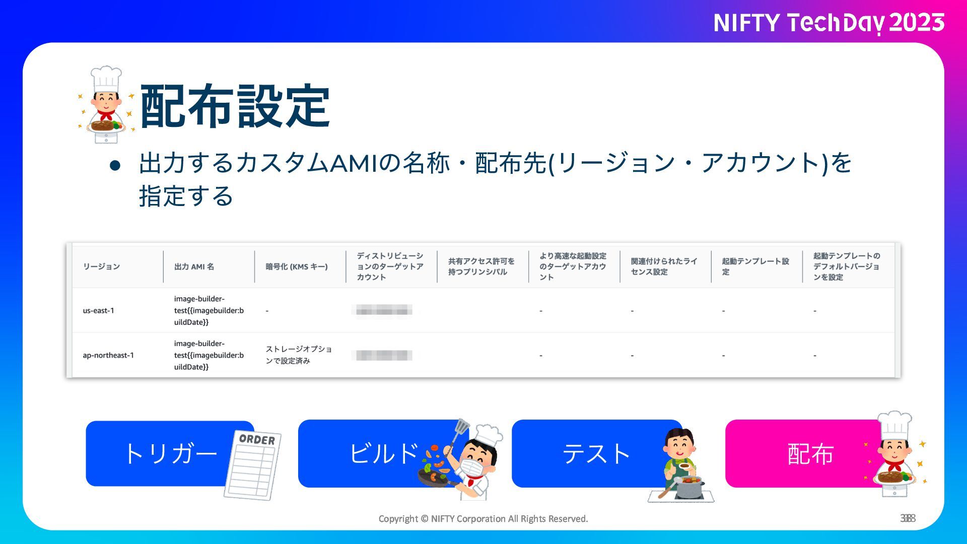 Corporation All Rights Reserved. Copyright © NIFTY Corporation All Rights Reserved. 37 • ϏϧυఔͰ࡞ͨ͠ΧελϜAMIΛ ࢦఆͨ͠ΞΧϯτɾϦʔδϣϯʹஔ͢Δఔ 37 τϦΨʔ Ϗϧυ ςετ