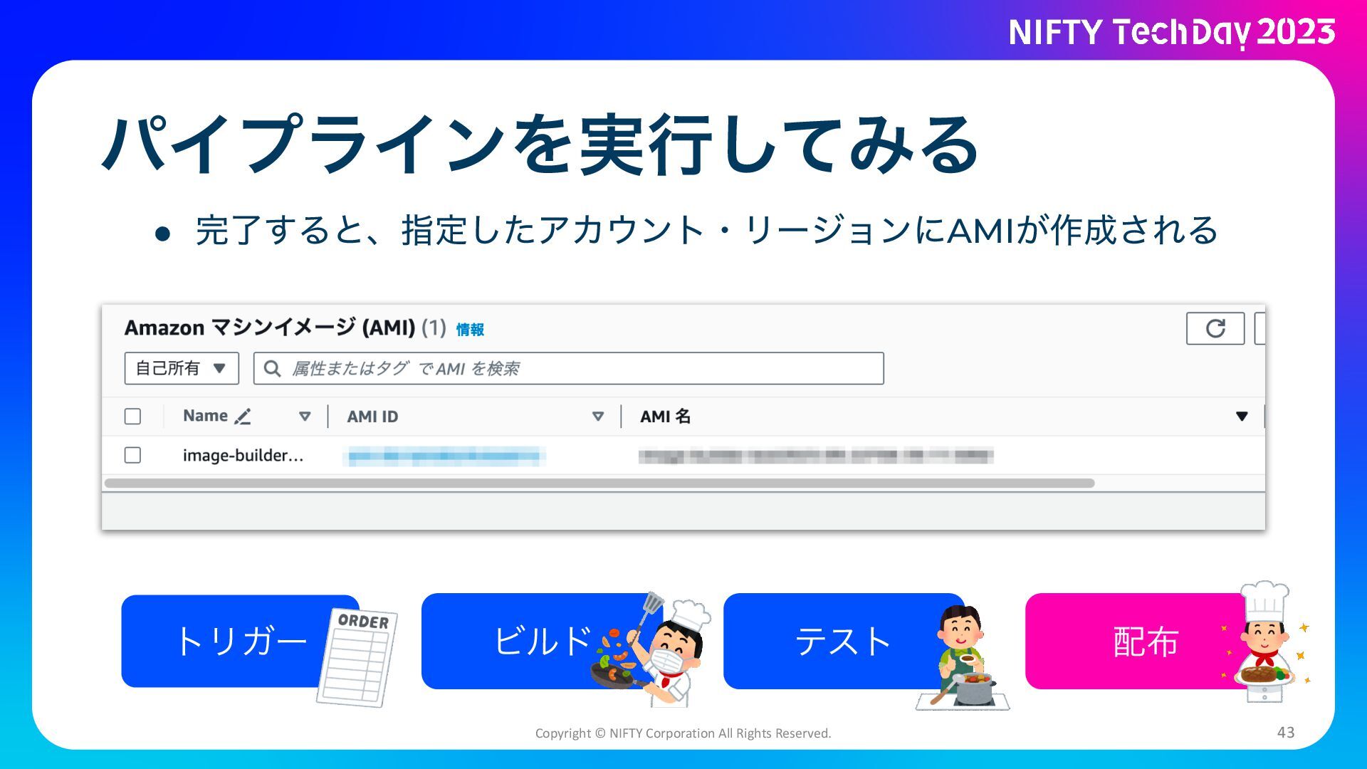 Corporation All Rights Reserved. Copyright © NIFTY Corporation All Rights Reserved. ઃఆ Copyright © NIFTY Corporation All Rights Reserved. 38 • ग़ྗ͢ΔΧελϜAMIͷ໊শɾઌ(ϦʔδϣϯɾΞΧϯτ)Λ ࢦఆ͢Δ Copyright © NIFTY Corporation All Rights Reserved. 38 38 τϦΨʔ Ϗϧυ ςετ