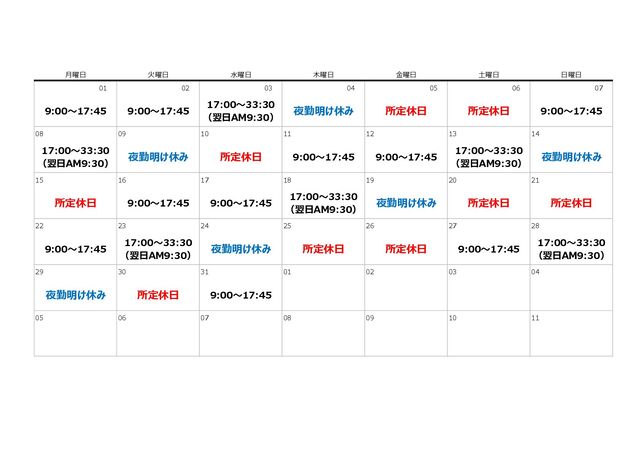 04 05 06 07 9:00~17:45 9:00~17:45 17:00~33:30 (翌日AM9:30) 夜勤明け休み 所定休日 所定休日 9:00~17:45 08 09 10 11 12 13 14 17:00~33:30 (翌日AM9:30) 夜勤明け休み 所定休日 9:00~17:45 9:00~17:45 17:00~33:30 (翌日AM9:30) 夜勤明け休み 15 16 17 18 19 20 21 所定休日 9:00~17:45 9:00~17:45 17:00~33:30 (翌日AM9:30) 夜勤明け休み 所定休日 所定休日 22 23 24 25 26 27 28 9:00~17:45 17:00~33:30 (翌日AM9:30) 夜勤明け休み 所定休日 所定休日 9:00~17:45 17:00~33:30 (翌日AM9:30) 29 30 31 01 02 03 04 夜勤明け休み 所定休日 9:00~17:45 05 06 07 08 09 10 11