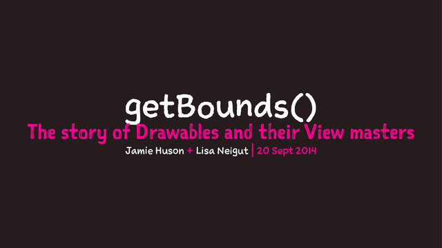 At Devoxx 2013, Cyril Mottier gave a great talk on Mastering Android Drawables. Hoping to build on that talk and go a bit more indepth into how to actually implement a custom drawable. What is a Drawable? How do you make one? How do they interact with their Views. Lisa’s got a few stories to share about writing a custom Drawable type from scratch. Do you know the difference between getMinimumHeight vs getIntrinsicHeight, and more importantly why making custom Drawables is painful. We’ll talk about the native Drawable types, how custom Drawables can be included in XML (hint, they can’t), the nuts and bolts of how Drawable instances share their constant state (So why bitmap images for Drawables get shared). Finally, we’ll go into the relationship between views and drawables -- how do drawables’ size get set, and what’s the difference between using a ColorDrawable versus a BitmapDrawable with respect to the View that is using the Drawable as a view backing.