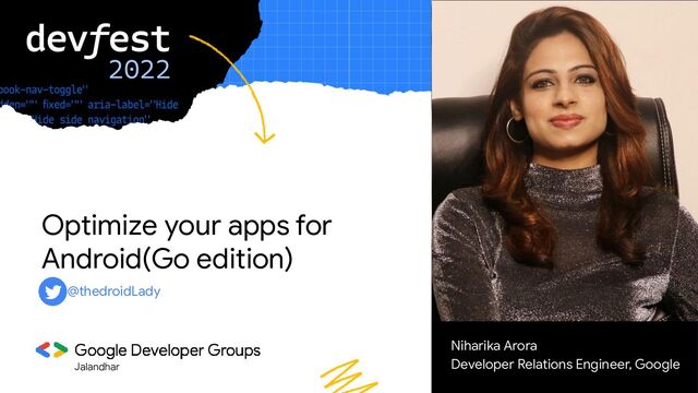 To help your app succeed and deliver the best possible experience in developing markets, In this session, I will talk about considerations that developers should keep in mind when adapting their apps to work well on Go devices. Not only do these best practices work for Go but all the Android devices across different versions and memory ranges (low/mid/high-end devices).
