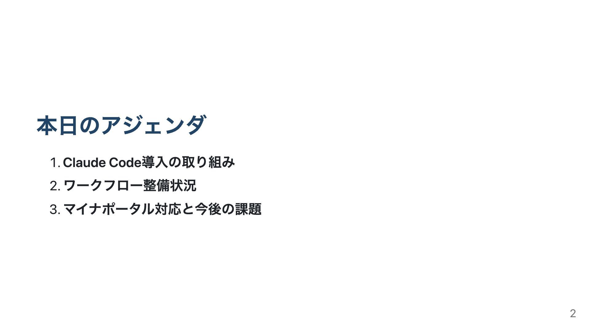 本日のアジェンダ 1. Claude Code導入の取り組み 2. ワークフロー整備状況 3. マイナポータル対応と今後の課題 2