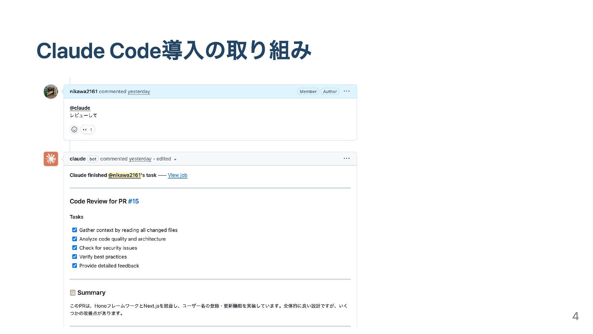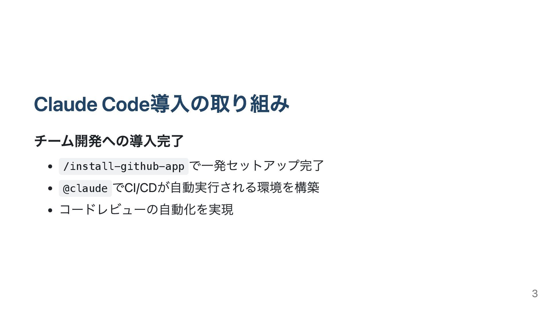 Claude Code導入の取り組み チーム開発への導入完了 /install-github-app で一発セットアップ完了 @claude でCI/CDが自動実行される環境を構築 コードレビューの自動化を実現 3