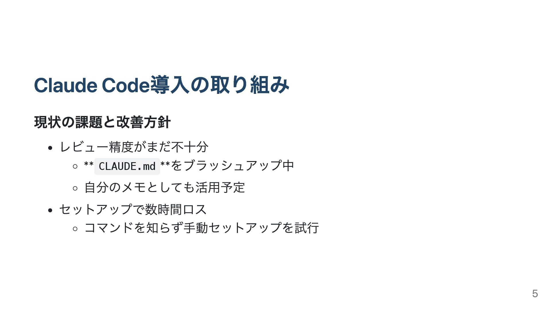 Claude Code導入の取り組み 現状の課題と改善方針 レビュー精度がまだ不十分 ** CLAUDE.md **をブラッシュアップ中 自分のメモとしても活用予定 セットアップで数時間ロス コマンドを知らず手動セットアップを試行
