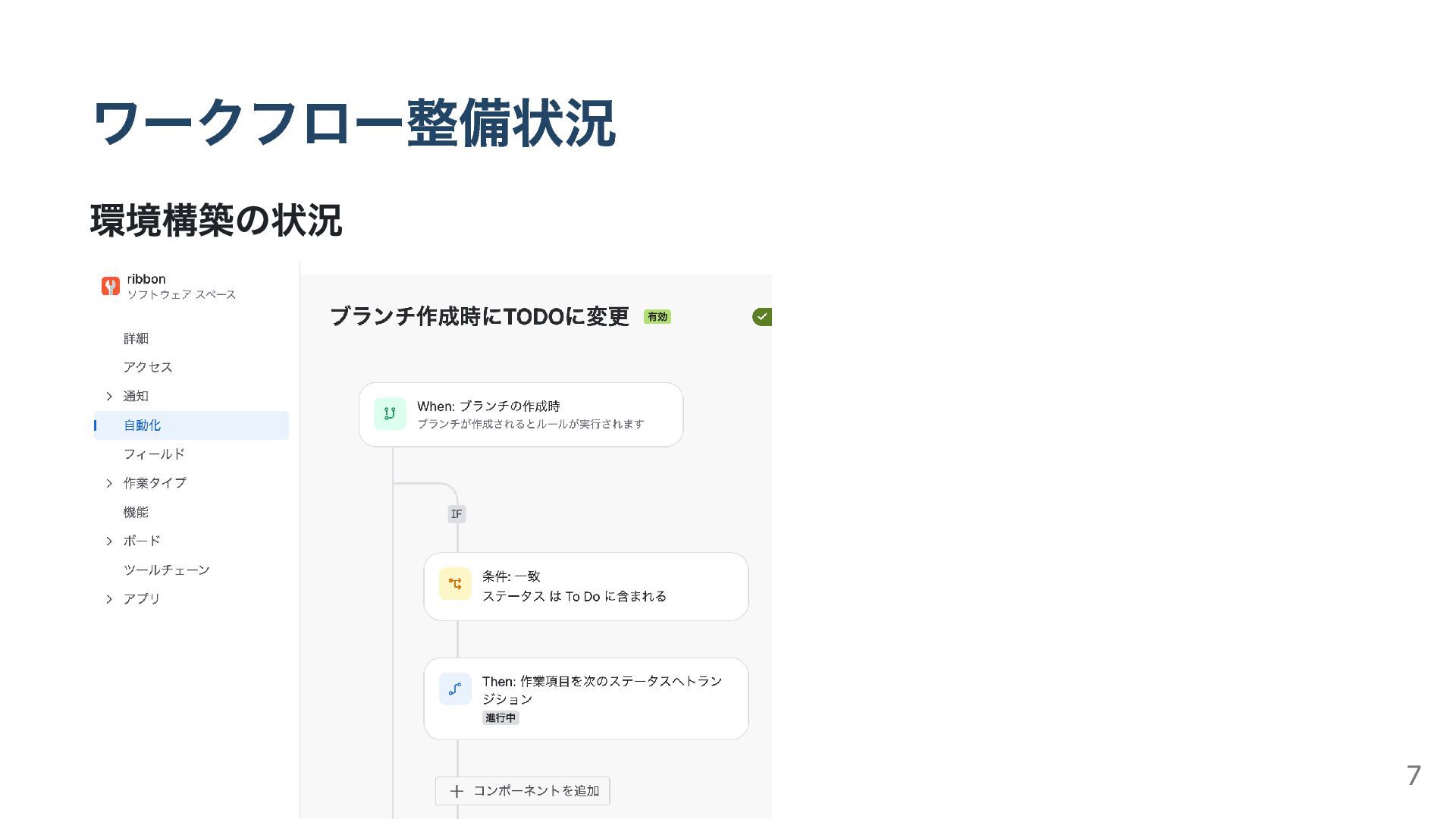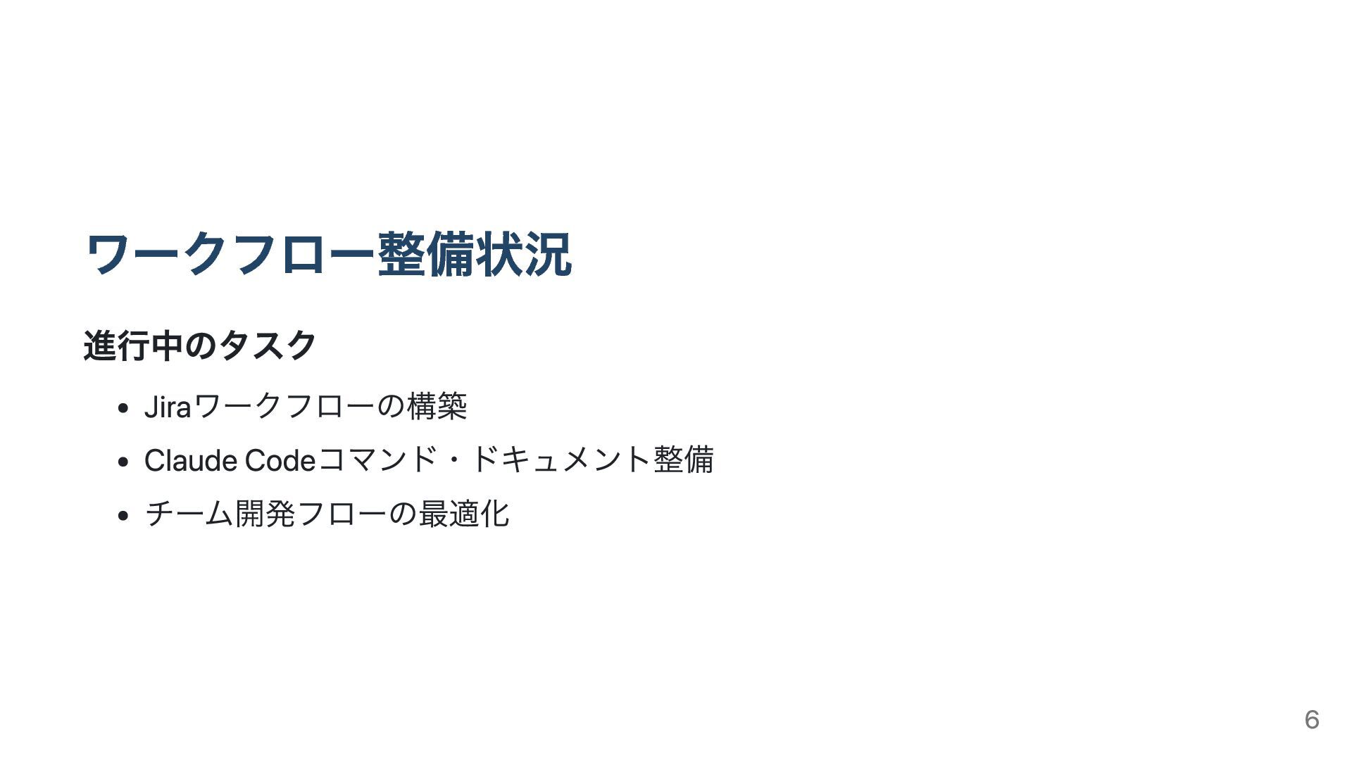 ワークフロー整備状況 進行中のタスク Jiraワークフローの構築 Claude Codeコマンド・ドキュメント整備 チーム開発フローの最適化 6