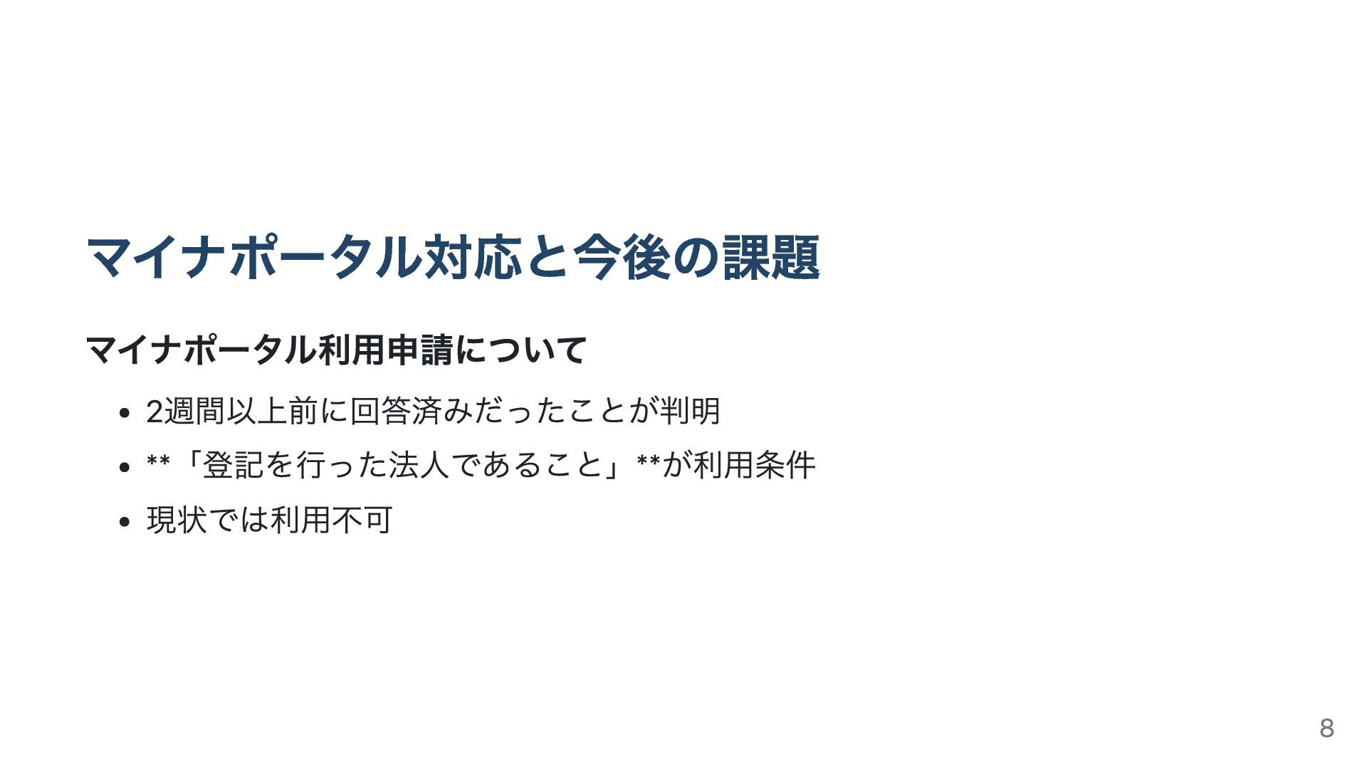 マイナポータル対応と今後の課題 マイナポータル利用申請について 2週間以上前に回答済みだったことが判明 **「登記を行った法人であること」**が利用条件 現状では利用不可 8