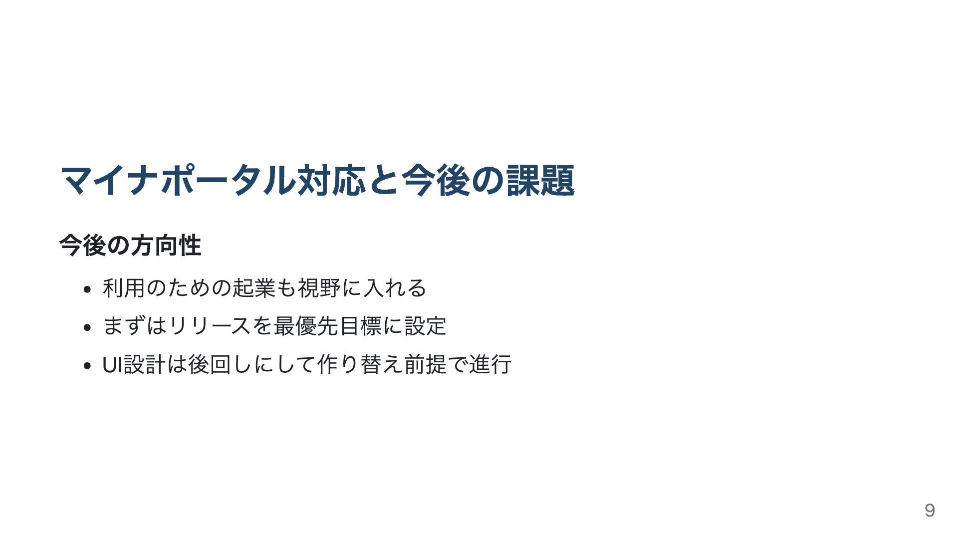 マイナポータル対応と今後の課題 今後の方向性 利用のための起業も視野に入れる まずはリリースを最優先目標に設定 UI設計は後回しにして作り替え前提で進行 9