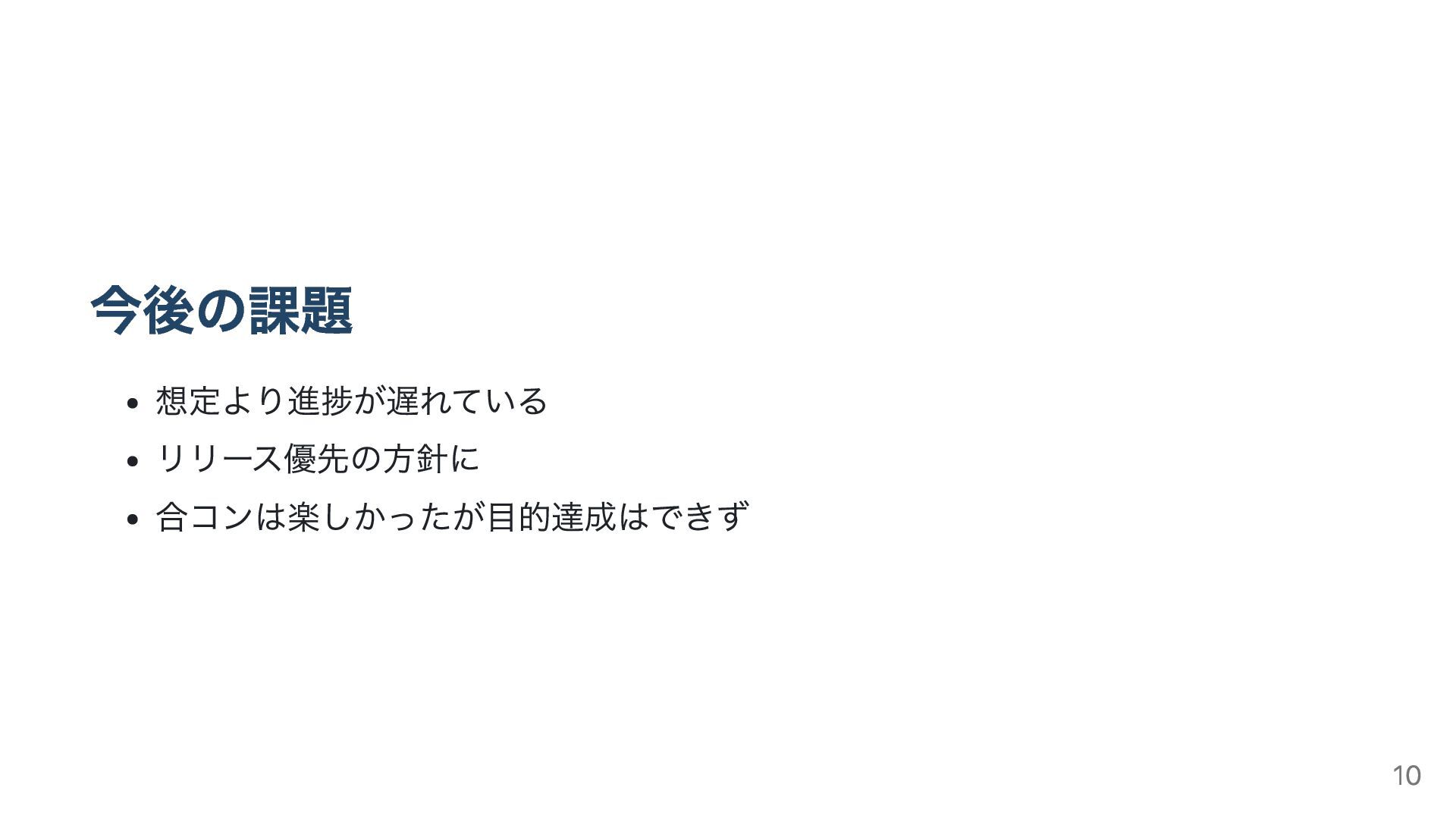 今後の課題 想定より進捗が遅れている リリース優先の方針に 合コンは楽しかったが目的達成はできず 10
