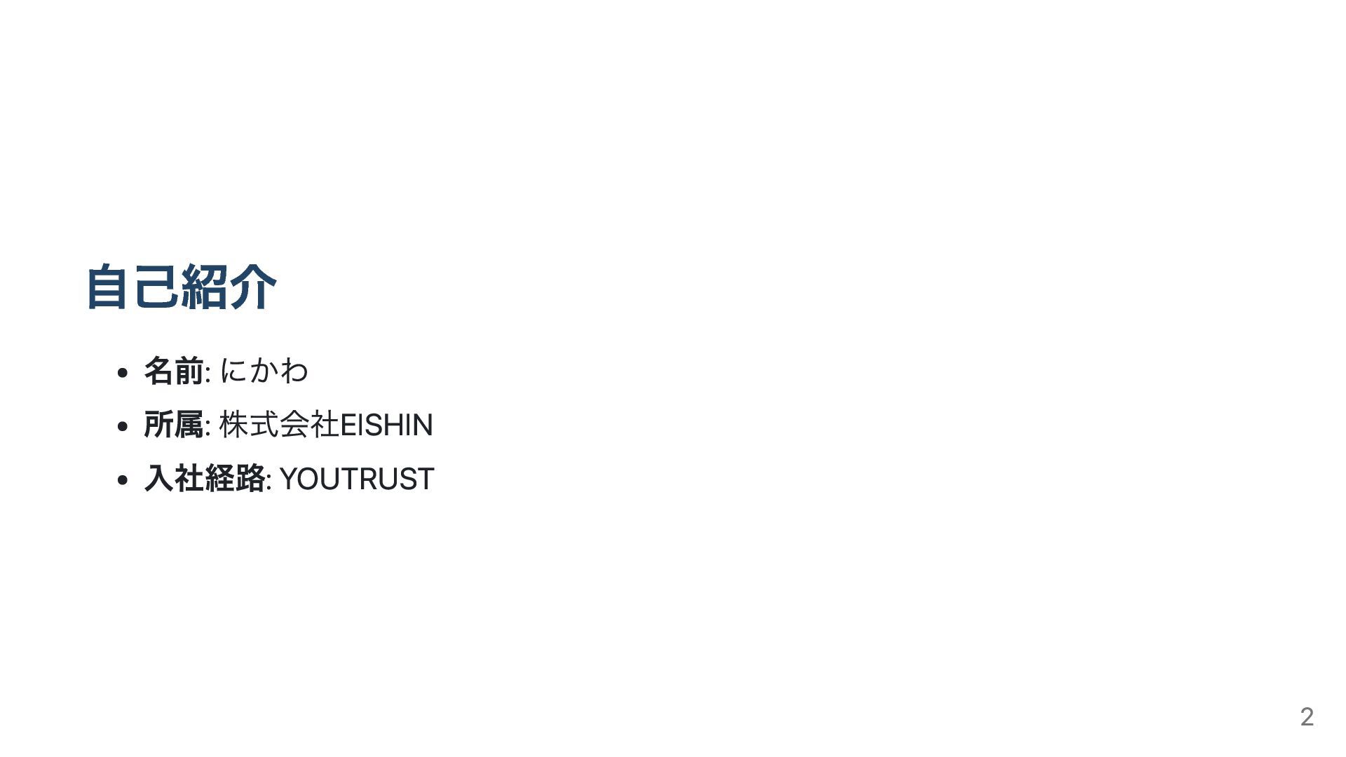 自己紹介 名前: にかわ 所属: 株式会社EISHIN 入社経路: YOUTRUST 2