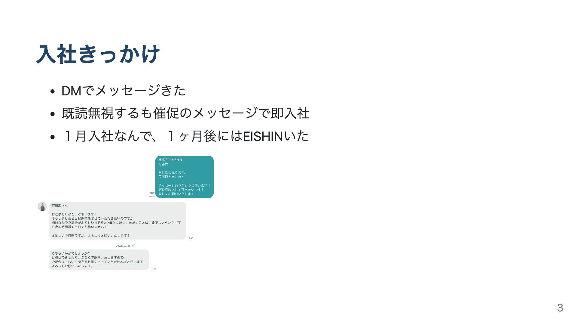 入社きっかけ DMでメッセージきた 既読無視するも催促のメッセージで即入社 1月入社なんで、1ヶ月後にはEISHINいた 3