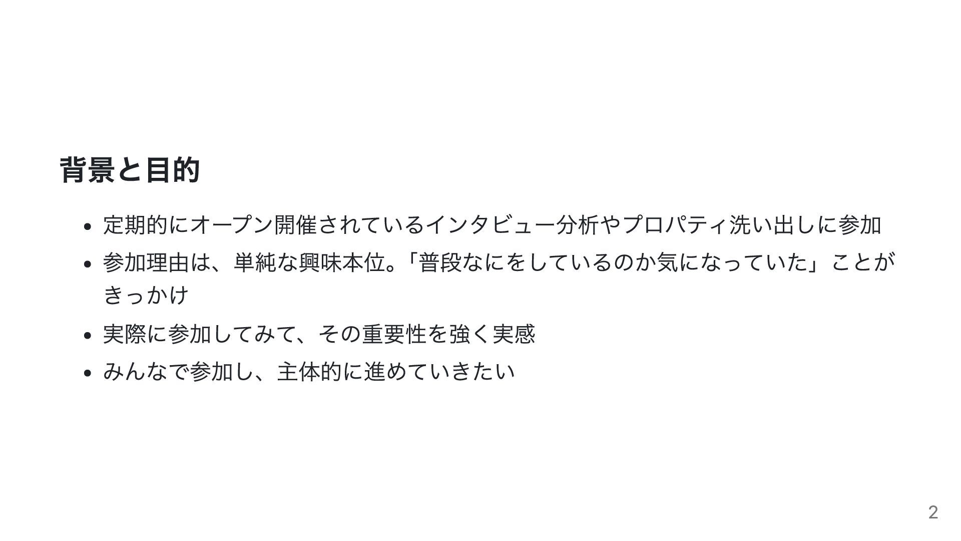 背景と目的 定期的にオープン開催されているインタビュー分析やプロパティ洗い出しに参加 参加理由は、単純な興味本位。 「普段なにをしているのか気になっていた」ことが きっかけ 実際に参加してみて、その重要性を強く実感 みんなで参加し、主体的に進めていきたい 2