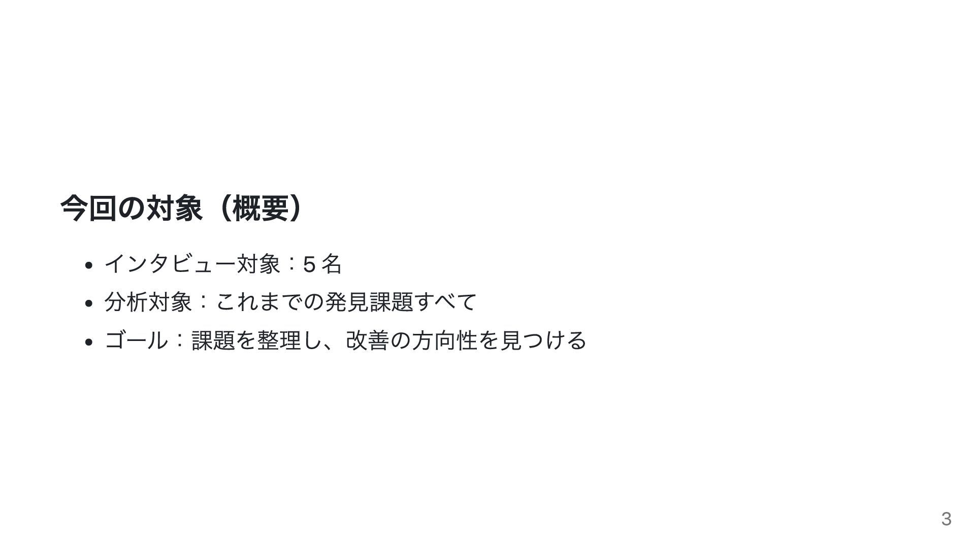 今回の対象(概要) インタビュー対象:5 名 分析対象:これまでの発見課題すべて ゴール:課題を整理し、改善の方向性を見つける 3
