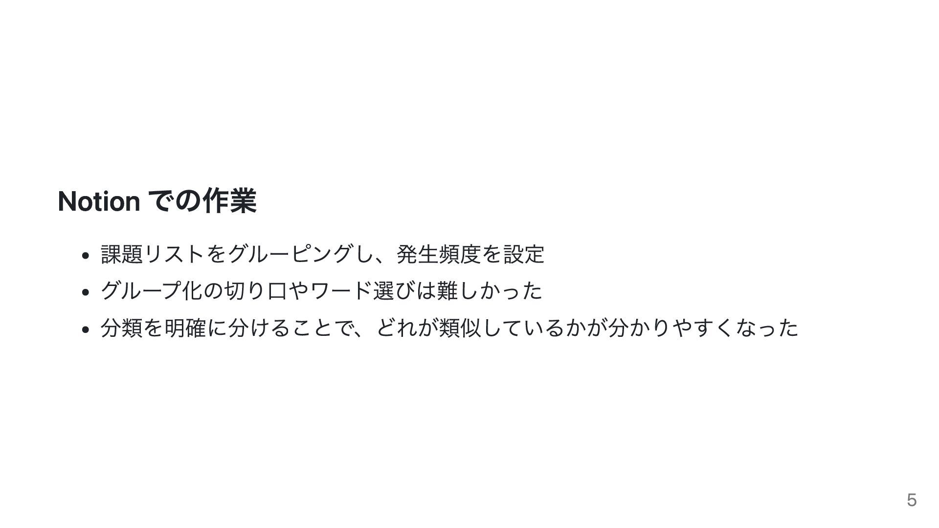 Notion での作業 課題リストをグルーピングし、発生頻度を設定 グループ化の切り口やワード選びは難しかった 分類を明確に分けることで、どれが類似しているかが分かりやすくなった 5