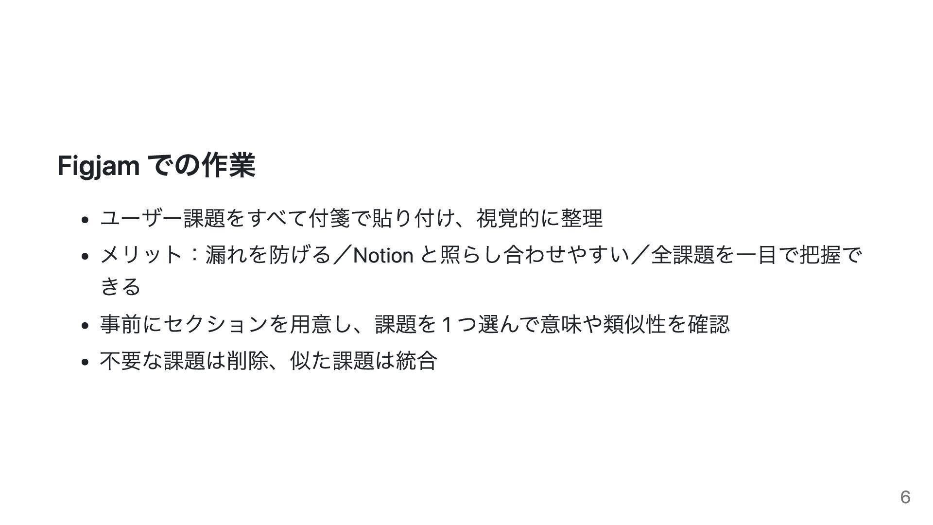 Figjam での作業 ユーザー課題をすべて付箋で貼り付け、視覚的に整理 メリット:漏れを防げる/Notion と照らし合わせやすい/全課題を一目で把握で きる 事前にセクションを用意し、課題を 1 つ選んで意味や類似性を確認 不要な課題は削除、似た課題は統合